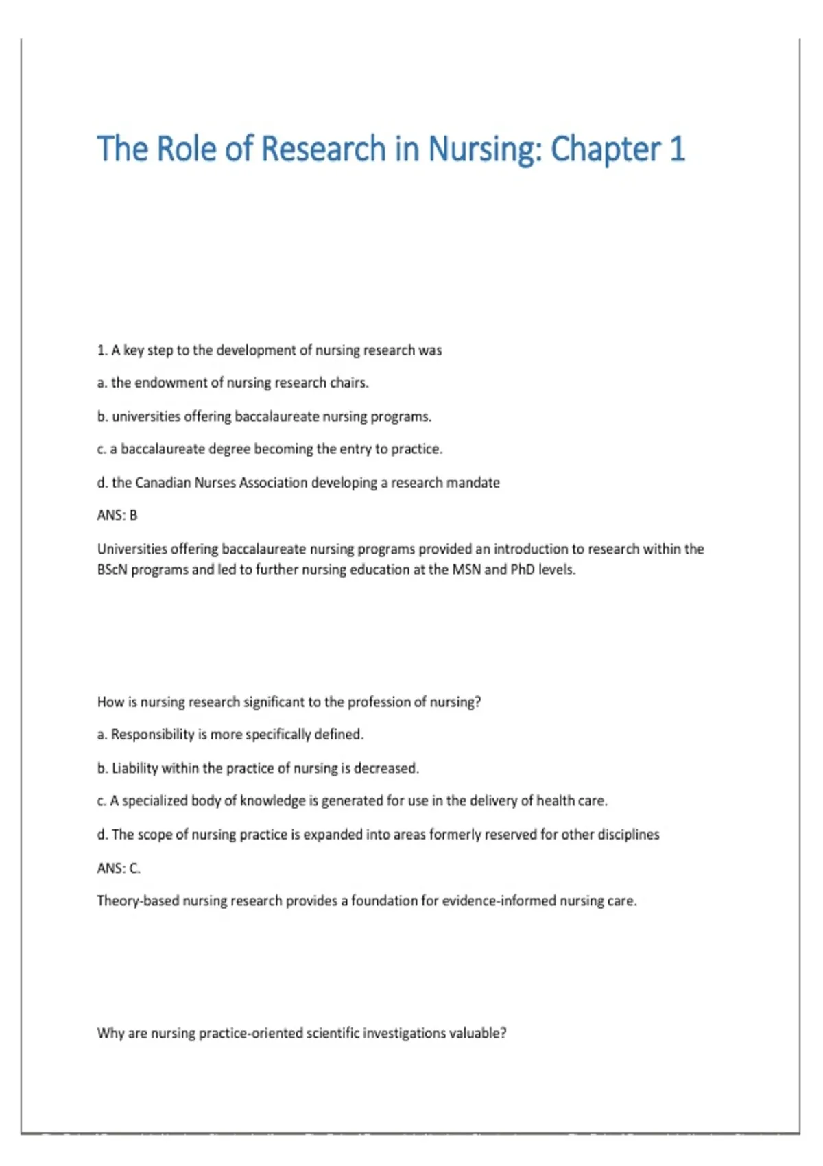 Prepare with The Role of Research in Nursing – Chapter 1 – converted, featuring verified questions and answers for 2025–2026. This resource covers foundational nursing research concepts, the research process, and evidence-based practice, providing clear rationales to help students understand, apply, and master nursing research principles for exams and coursework.