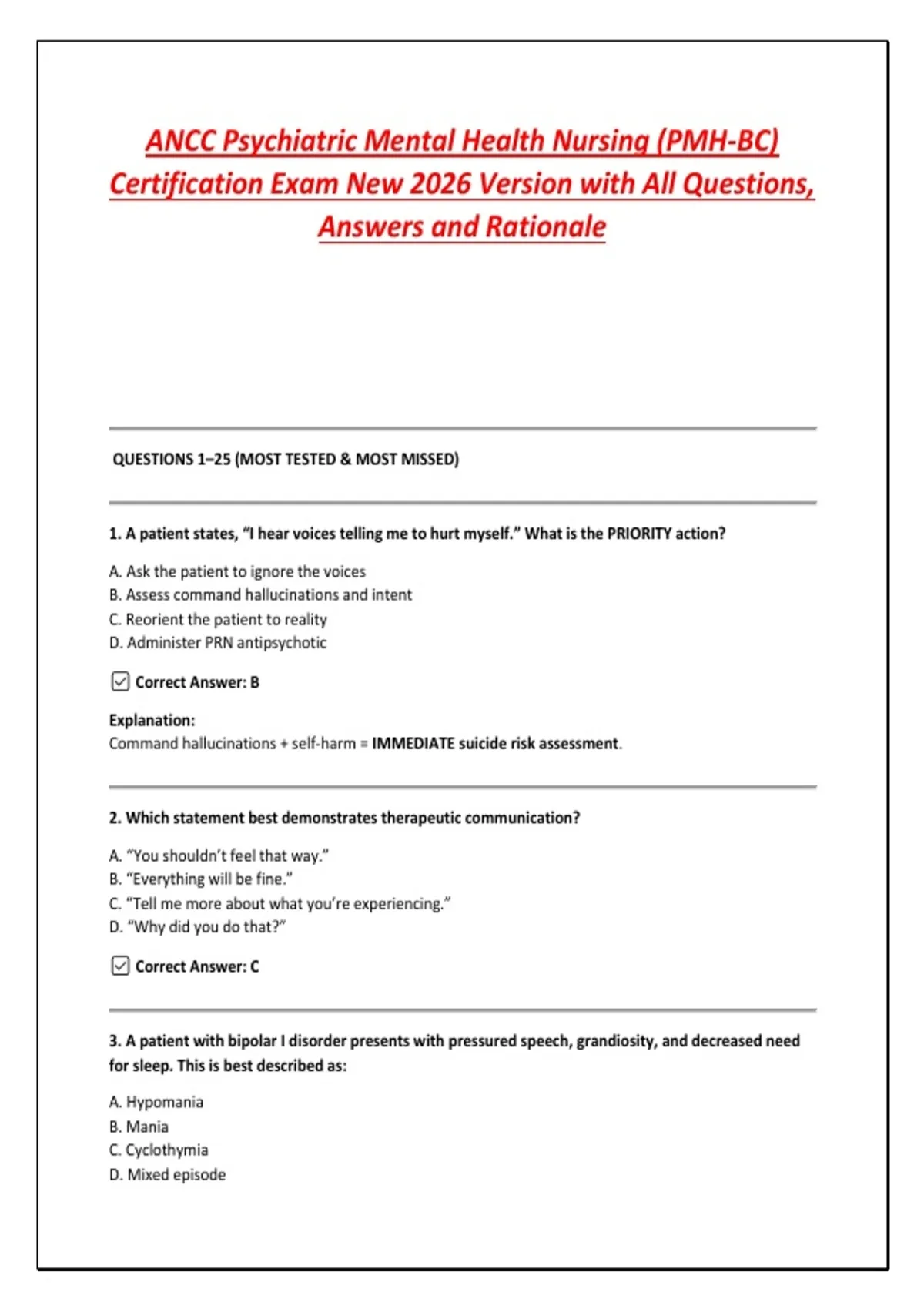 ANCC Psychiatric Mental Health Nursing (PMH-BC) Certification Exam New 2026 Version with All Questions, Answers and Rationale