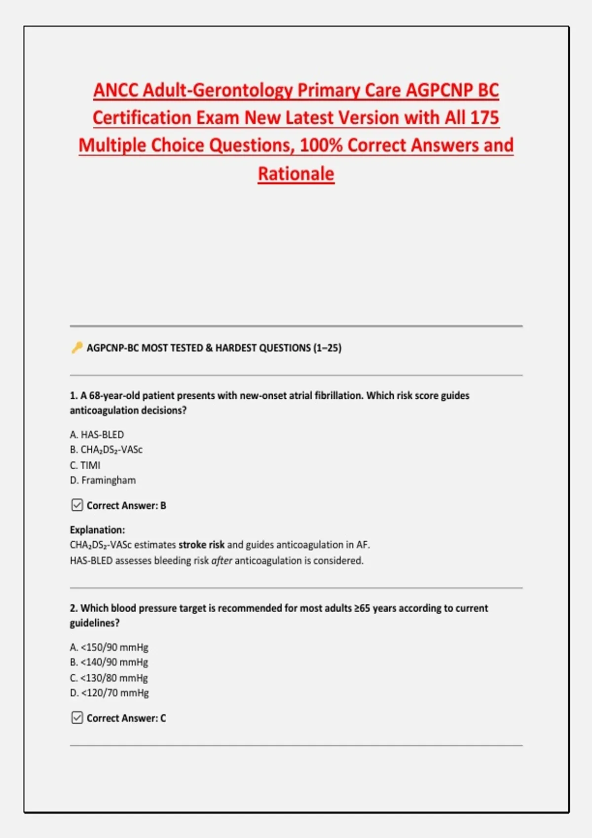ANCC Adult-Gerontology Primary Care AGPCNP BC Certification Exam New Latest Version with All 175 Multiple Choice Questions, 100% Correct Answers and Rationale