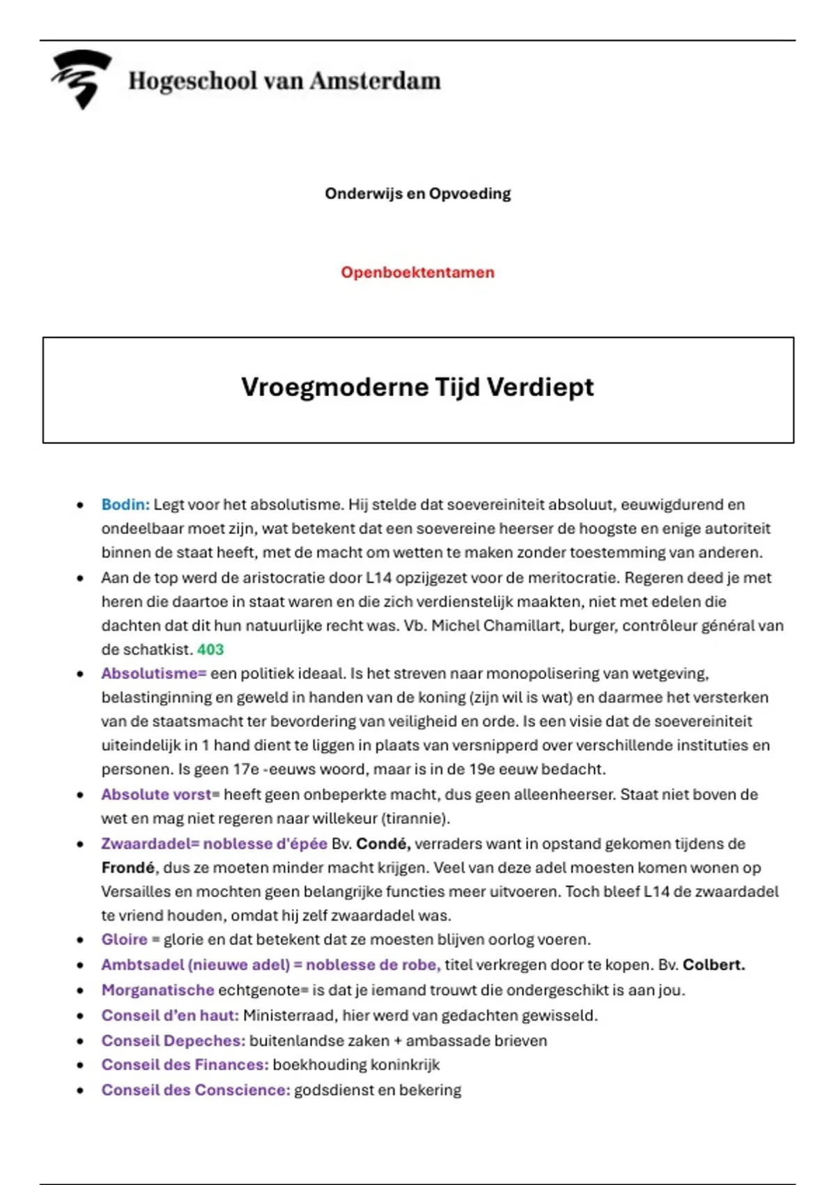 In dit document komen alle aantekeningen voorbij van de colleges bij het vak Vroegmoderne geschiedenis Verdiept, aangevuld met aantekeningen uit 'De Zonnekoning' van Johan Op de Beeck. Het is een samenvatting in schemavorm op onderwerp en op chronologische volgorde. In de samenvatting worden ook de voorbeeld tentamenvragen uitgewerkt. Dit document mag bij het openboek tentamen gebruikt worden. Ik had een 9!