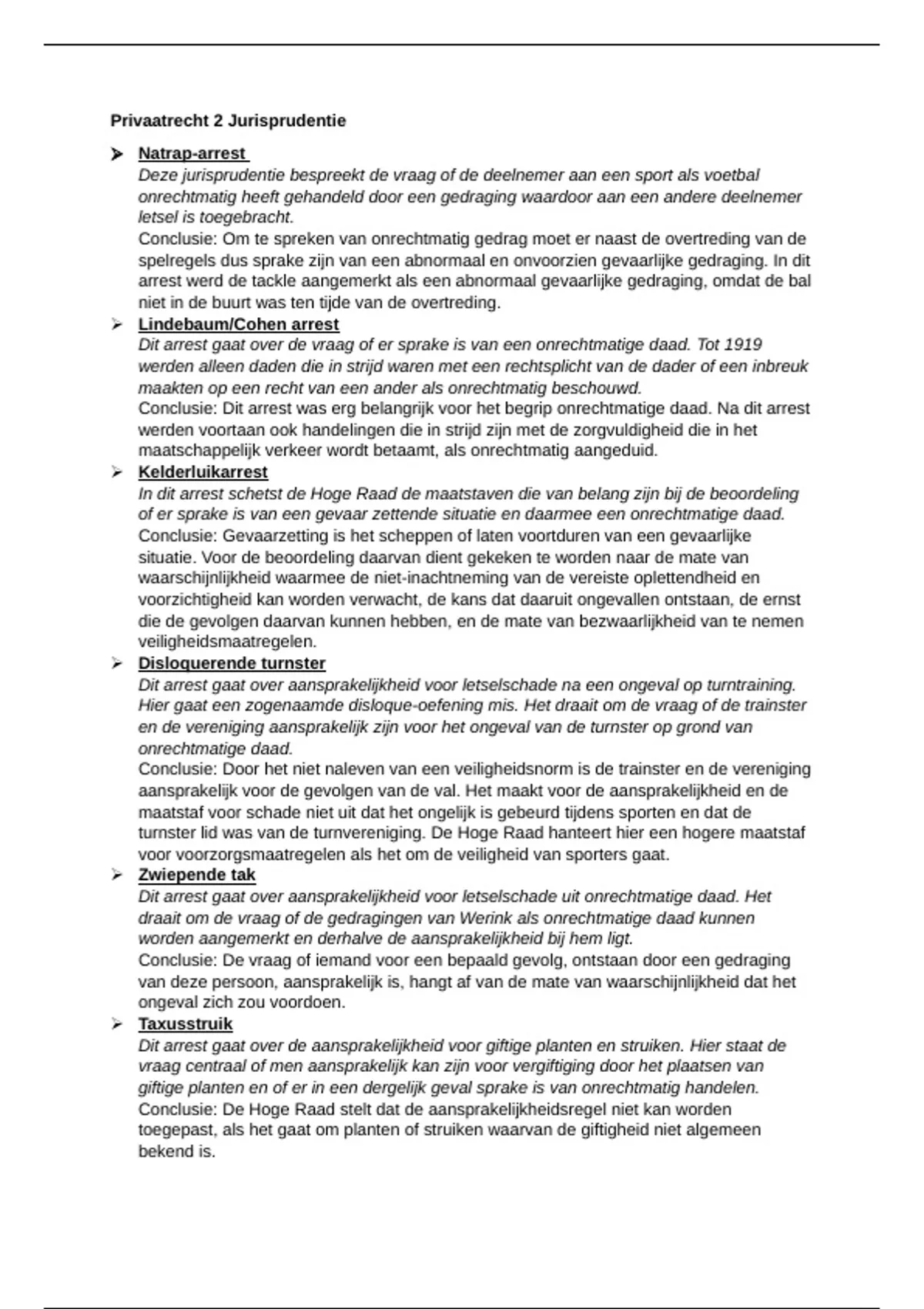 Arresten van de verplichte cursus Privaatrecht 2. Hierbij geef ik een kort samenvatting en conclusie van elk arrest om ze makkelijk te onthouden voor de tentamen.