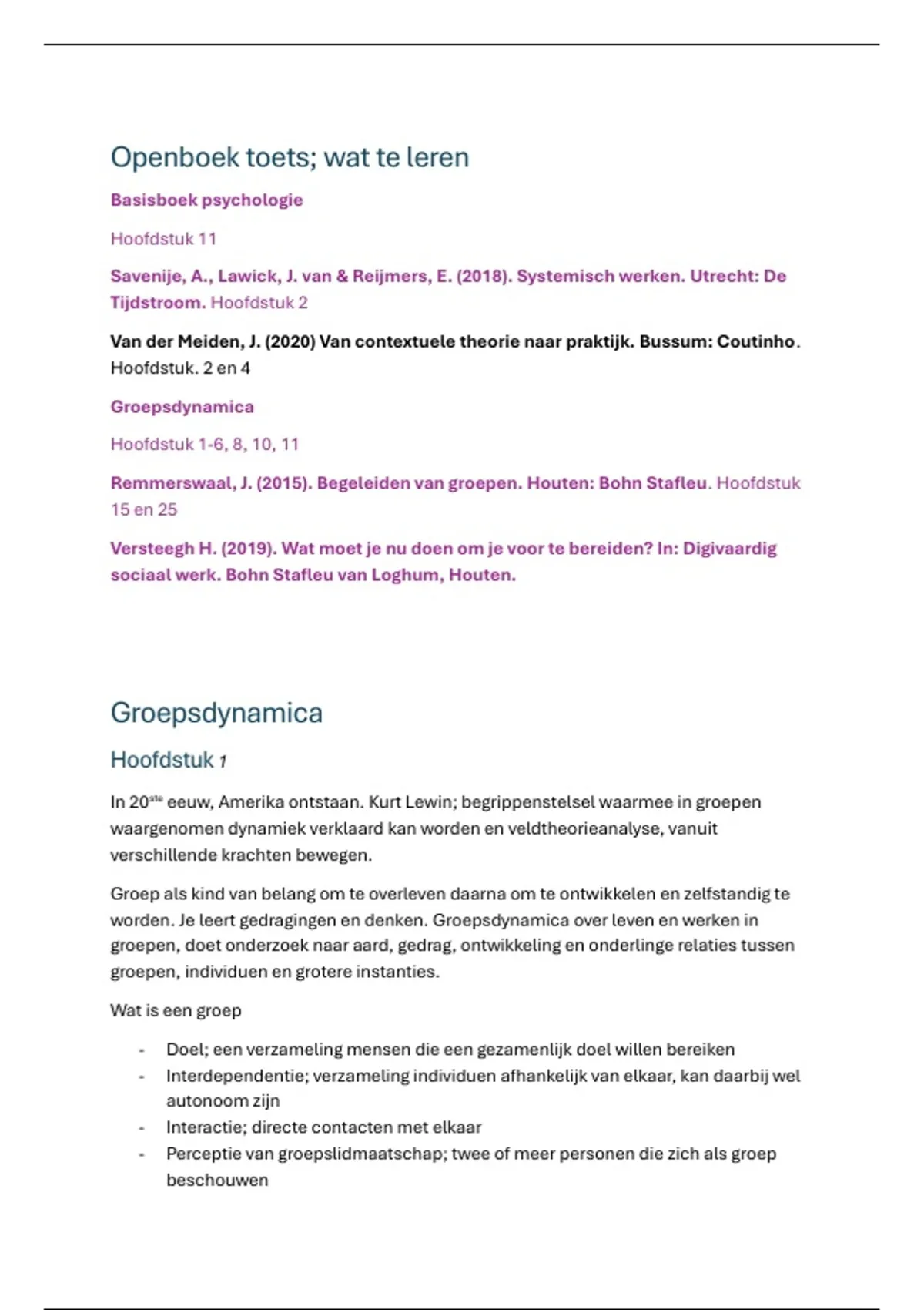 Op basis van toetsmatrijs samengestelde samenvatting. Boek groepsdynamica wordt behandeld en andere artikelen. Bereid je goed voor op het tentamen