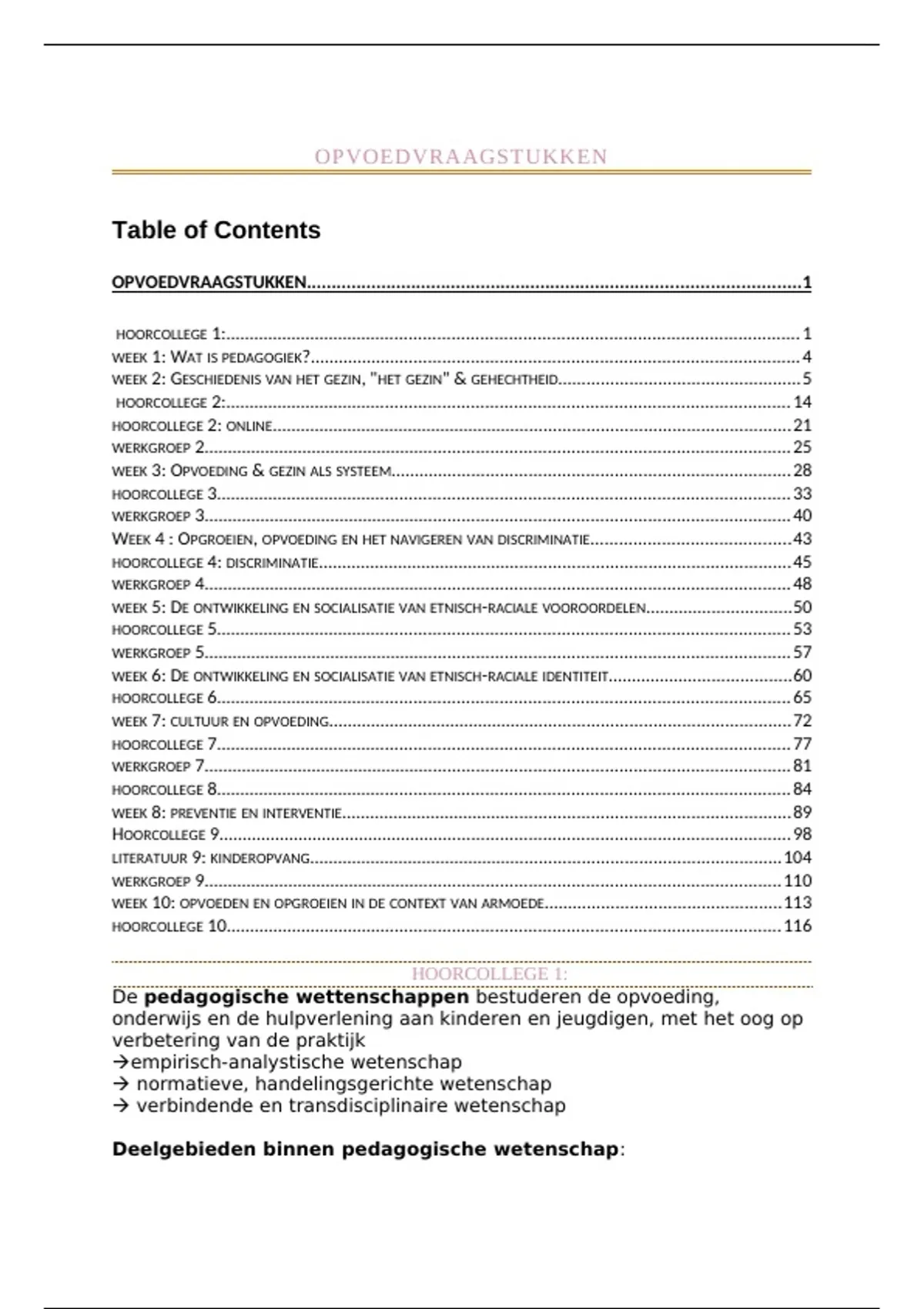 Minor Opvoedvraagstukken – complete samenvatting hoorcolleges, literatuur & werkgroepen Deze zeer uitgebreide en overzichtelijke samenvatting is bedoeld voor de Minor Opvoedvraagstukken en behandelt alle weken, hoorcolleges, literatuur en werkgroepen. De samenvatting combineert theorie, empirisch onderzoek én praktische toepassingen, waardoor de stof goed te begrijpen én toe te passen is op tentamenvragen en casussen. Wat zit erin? Volledige uitwerking van alle hoorcolleges (1 t/m 9) Overzichtelijke samenvattingen van alle weken (1 t/m 10) Uitgewerkte werkgroepopdrachten en casussen Heldere uitleg van belangrijke thema’s zoals: Wat is pedagogiek? (empirisch, normatief en handelingsgericht) Gehechtheidstheorie (Bowlby, Ainsworth, Strange Situation) Sensitiviteit, opvoedingsstijlen en ouderlijk gedrag Ecologisch model van Bronfenbrenner Procesmodel van Belsky & transactioneel model van Sameroff Opvoeden in context van scheiding, armoede en discriminatie Etnisch-raciale socialisatie en identiteit Cultuur en opvoeding Preventie en interventie in opvoedvraagstukken Duidelijke koppeling tussen theorie en praktijk Veel schema’s, definities en concrete voorbeelden Waarom deze samenvatting? Alles in één document: colleges, literatuur én werkgroepen Zeer gestructureerd en logisch opgebouwd Complexe theorieën helder uitgelegd Ideaal voor tentamenvoorbereiding en casustoepassing Bespaart veel tijd en voorkomt losse aantekeningen Extra informatie Vak: Minor Opvoedvraagstukken Taal: Nederlands Niveau: Universitair Inhoud: hoorcolleges, literatuur, werkgroepen & casussen Gebruik: leren, herhalen, tentamenvoorbereiding