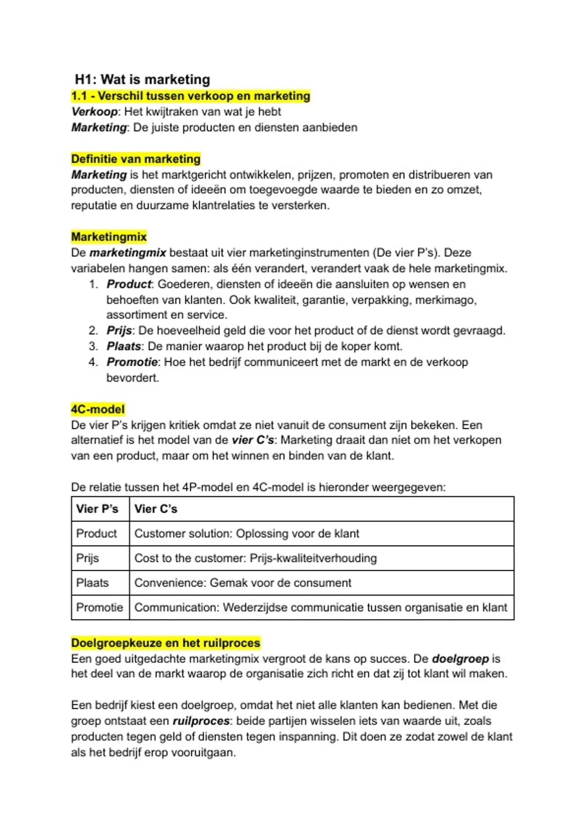 Deze overzichtelijke Active Learning samenvatting Marketing helpt je om snel en effectief te studeren voor tentamens. In dit document wordt het volledige marketingboek stap voor stap uitgelegd, inclusief alle belangrijke theorie, modellen en begrippen die je moet kennen. Onder andere komen het marketingconcept, klantsegmenten, de 3 R’s, Ansoff-matrix, micro-, meso- en macro-omgeving, Triple P, mission statement en de sleuteltaken van marketing uitgebreid aan bod. Alle hoofdstukken zijn helder samengevat en logisch opgebouwd, zodat je eenvoudig de samenhang tussen de onderwerpen begrijpt. De samenvatting is duidelijk, gestructureerd en ideaal als tentamenvoorbereiding, herhaling of naslagwerk tijdens colleges. Door de kern van de stof compact maar volledig weer te geven, bespaar je tijd zonder belangrijke informatie te missen. Perfect voor studenten die marketing op een begrijpelijke, complete en efficiënte manier willen leren en met vertrouwen hun toets in willen gaan.