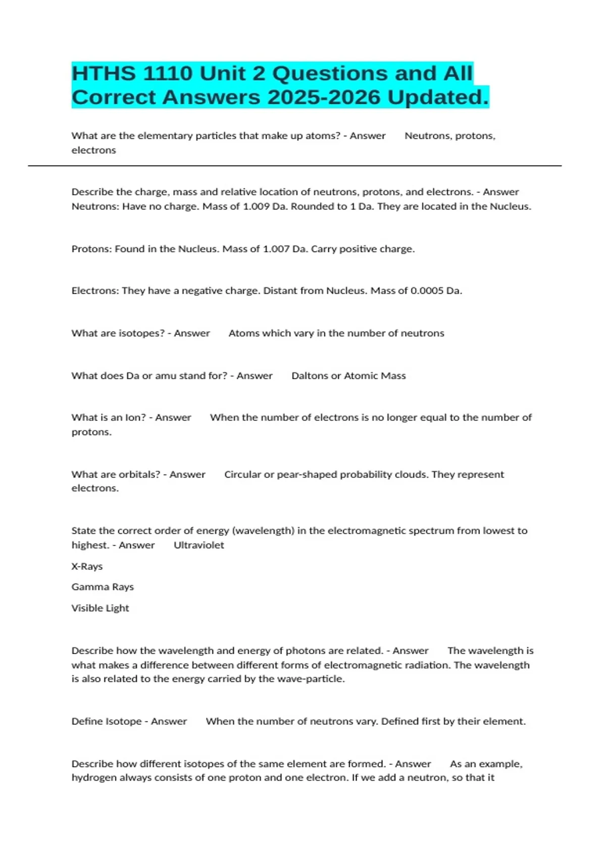 What are the elementary particles that make up atoms? - Answer Neutrons, protons, electrons Describe the charge, mass and relative location of neutrons, protons, and electrons. - Answer Neutrons: Have no charge. Mass of 1.009 Da. Rounded to 1 Da. They are located in the Nucleus. Protons: Found in the Nucleus. Mass of 1.007 Da. Carry positive charge. Electrons: They have a negative charge. Distant from Nucleus. Mass of 0.0005 Da. What are isotopes? - Answer Atoms which vary in the number of neutrons What does Da or amu stand for? - Answer Daltons or Atomic Mass What is an Ion? - Answer When the number of electrons is no longer equal to the number of protons. What are orbitals? - Answer Circular or pear-shaped probability clouds. They represent electrons. State the correct order of energy (wavelength) in the electromagnetic spectrum from lowest to highest. - Answer Ultraviolet X-Rays Gamma Rays Visible Light Describe how the wavelength and energy of photons are related. - Answer The wavelength is what makes a difference between different forms of electromagnetic radiation. The wavelength is also related to the energy carried by the wave-particle. Define Isotope - Answer When the number of neutrons vary. Defined first by their element. Describe how different isotopes of the same element are formed. - Answer As an example, hydrogen always consists of one proton and one electron. If we add a neutron, so that it