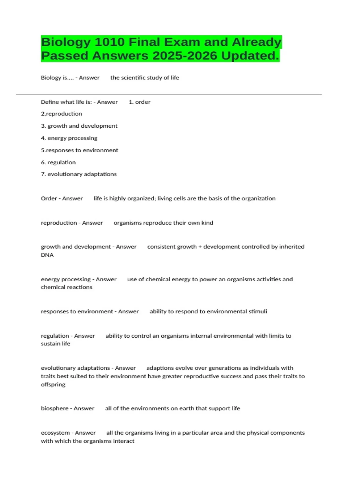 Biology 1010 Final Exam and Already Passed Answers Updated.