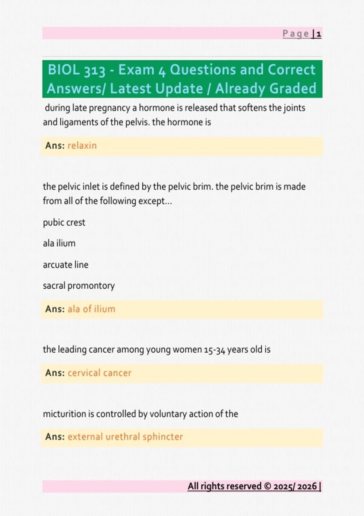 during late pregnancy a hormone is released that softens the joints and ligaments of the pelvis. the hormone is Ans: relaxin the pelvic inlet is defined by the pelvic brim. the pelvic brim is made from all of the following except... pubic crest ala ilium arcuate line sacral promontory Ans: ala of ilium the leading cancer among young women 15-34 years old is Ans: cervical cancer micturition is controlled by voluntary action of the Ans: external urethral sphincter All rights reserved © 2025/ 2026 | Page | 2 the longest part of the male urethra is the Ans: spongy urethra in order to successfully give birth vaginally the obstetric conjugate must be Ans: at least 10 cm what is the maximum capacity of the male urinary bladder Ans: 750-1000 mL A ____ is a surgical procedure to enlarge the vaginal orifice during parturition (child birth) Ans: episiotomy which muscle is not part of the pelvic floor... piriformis levator ani coccygeus pubococcygeus Ans: piriformis All rights reserved © 2025/ 2026 | Page | 3 the prostate is pier