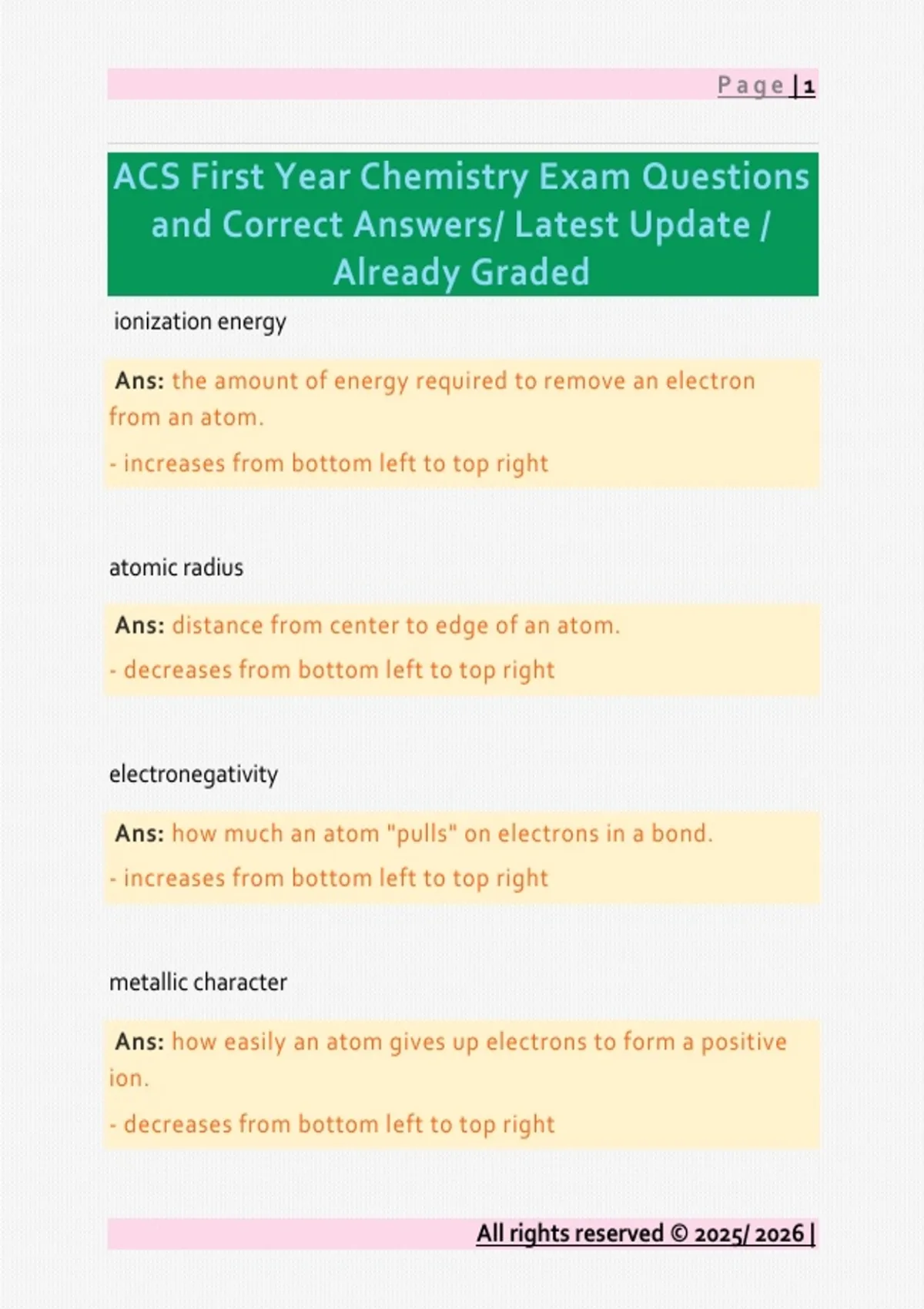 ACS First Year Chemistry Exam Questions