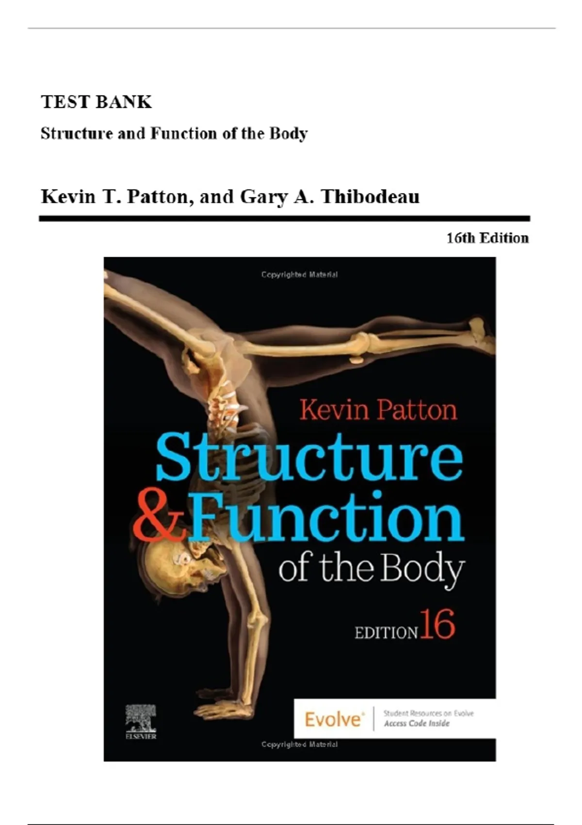 This complete test bank for Structure and Function of the Body, 16th Edition by Kevin T. Patton, Thompson, and Williamson delivers comprehensive, chapter-by-chapter practice questions with accurate answers to support student success in anatomy and physiology courses. It covers cellular structure, tissues, body systems, homeostasis, and physiological processes with clear clinical relevance. Ideal for nursing, allied health, health science, and A&P programs, supporting exams, quizzes, and foundational coursework for 2025/2026 academic use.