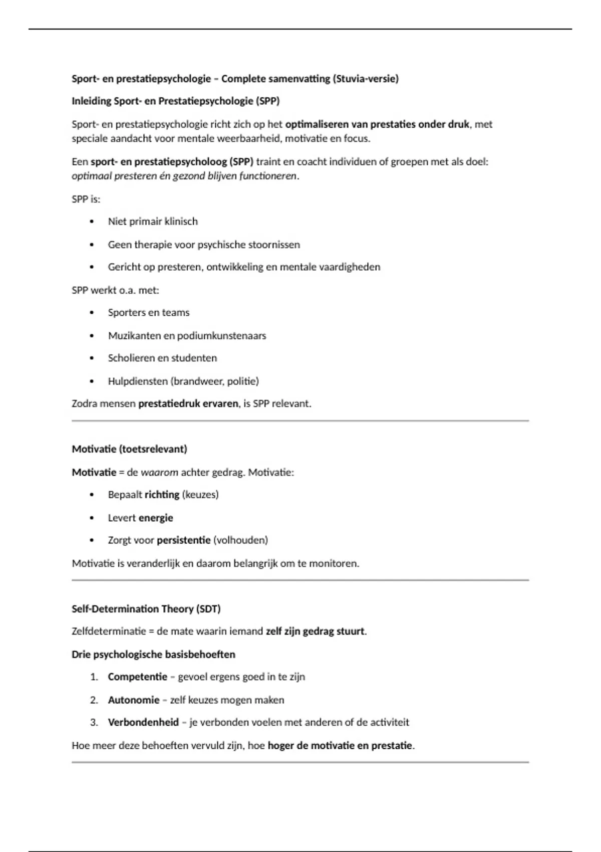 Deze complete samenvatting van het vak Sport- en Prestatiepsychologie biedt een helder en overzichtelijk overzicht van alle belangrijke theorieën en concepten die nodig zijn voor tentamenvoorbereiding. Het document richt zich op het optimaliseren van prestaties onder druk en behandelt hoe motivatie, focus, stress en mentale vaardigheden van invloed zijn op presteren. In de samenvatting komen onder andere motivatie en de Self-Determination Theory (SDT) aan bod, inclusief het motivatiecontinuüm van amotivatie tot intrinsieke motivatie. Daarnaast wordt uitgebreid ingegaan op doelen stellen, prestatiedruk, stress en spanning, en het verschil tussen choking en clutch presteren. Ook onderwerpen als arousal, de Individual Zone of Optimal Functioning (IZOF), copingstrategieën, gedachten en zelfspraak, focus en aandacht worden duidelijk uitgelegd. Verder besteedt het document aandacht aan gezond presteren, burn-outpreventie, mindset (growth vs. fixed), jeugdsport en de invloed van ouders en trainers, en het concept flow. De samenvatting is logisch opgebouwd, bevat tentamenrelevante uitleg en is geschreven in duidelijke taal, waardoor de stof makkelijk te begrijpen en te onthouden is. Deze samenvatting is geschikt voor hbo- en wo-studenten en ideaal voor studenten die efficiënt en doelgericht willen studeren voor hun tentamen Sport- en Prestatiepsychologie.