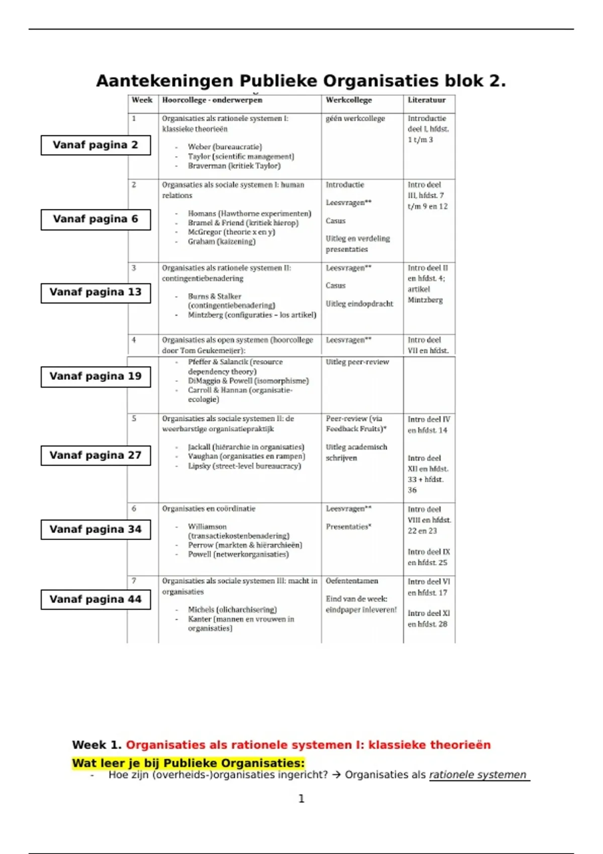 Deze uitgebreide samenvatting bevat alle tentamenstof van Publieke Organisaties – Blok 2. De aantekeningen zijn gebaseerd op het boek The Sociology of Organizations én de PowerPointpresentaties van de hoorcolleges. De stof is overzichtelijk uitgewerkt per week en sluit nauw aan bij wat tijdens het vak en op het tentamen wordt behandeld. In deze samenvatting komen onder andere de volgende onderwerpen aan bod: Organisaties als rationele, sociale en open systemen Klassieke organisatietheorieën: Weber, Fayol en Taylor Human Relations & Humanistic Management (Mayo, Maslow, Herzberg, McGregor) Participatie en controle (o.a. Graham met Kaizening) Contingentiebenadering (Burns & Stalker, Mintzberg) Resource Dependency Theory (Pfeffer & Salancik) Neo-institutionalisme & isomorfisme (DiMaggio & Powell) Organizational Ecology (Hannan & Carroll) Street-level bureaucracy (Lipsky) Organisatorische rampen en normalisering van afwijkingen (Vaughan) Macht, moraal en hiërarchie in organisaties (Jackall) Transactiekostenbenadering (Williamson) Etc, De samenvatting bevat duidelijke definities, vergelijkingen tussen theorieën, kritische reflecties en concrete voorbeelden. Hierdoor is het document niet alleen geschikt om theorieën te begrijpen, maar ook om ze te herkennen en toe te passen in tentamenvragen en casussen. Resultaat: met deze samenvatting heb ik zelf een 9,0 gehaald voor het tentamen.