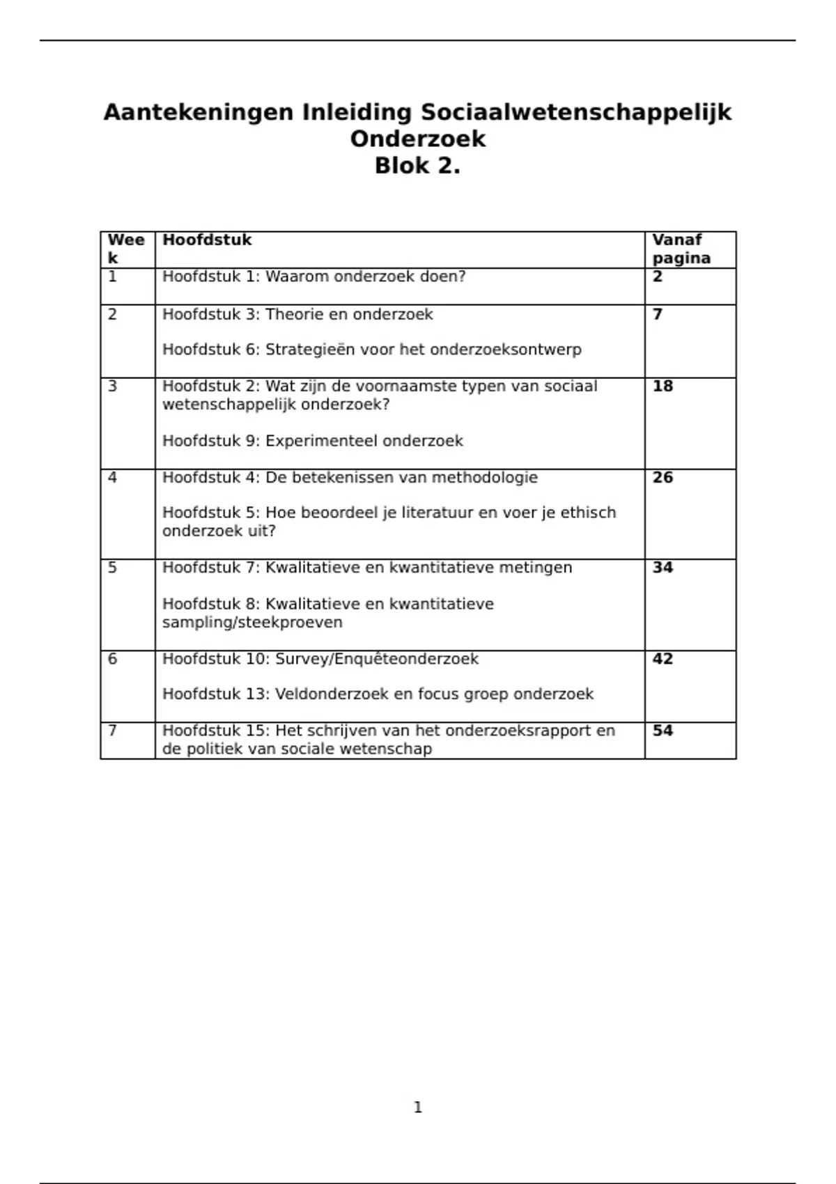 Deze zeer uitgebreide samenvatting bevat alle tentamenstof van Inleiding Sociaalwetenschappelijk Onderzoek. De aantekeningen zijn gebaseerd op het voorgeschreven studieboek en de PowerPointpresentaties van de hoorcolleges. De stof is overzichtelijk uitgewerkt per week en behandelt zowel de theoretische als methodologische kernbegrippen die essentieel zijn voor het tentamen. In deze samenvatting komen onder andere de volgende onderwerpen uitgebreid aan bod: Doel en kenmerken van sociaalwetenschappelijk onderzoek Fundamenteel vs. toegepast onderzoek Kwantitatief vs. kwalitatief onderzoek Deductief en inductief redeneren Theorie, concepten, proposities en hypothesen Units of analysis en analyseniveaus (micro, meso, macro) Causaliteit en veelgemaakte denkfouten (schijnverband, ecologische fout, reductie, tautologie) Onderzoeksontwerpen en triangulatie Experimenteel onderzoek, quasi-experimenten en surveys Interne en externe validiteit Filosofische grondslagen: ontologie en epistemologie Positivistische vs. interpretatieve sociale wetenschap (PSS vs. ISS) Betrouwbaarheid en validiteit (kwantitatief én kwalitatief) Metingen, operationalisatie en constructen Ethiek en wetenschappelijke integriteit Literatuurstudie en onderzoeksethiek (o.a. Neurenberg Code) Resultaat: met deze samenvatting heb ik zelf een 7,7 gehaald voor dit vak