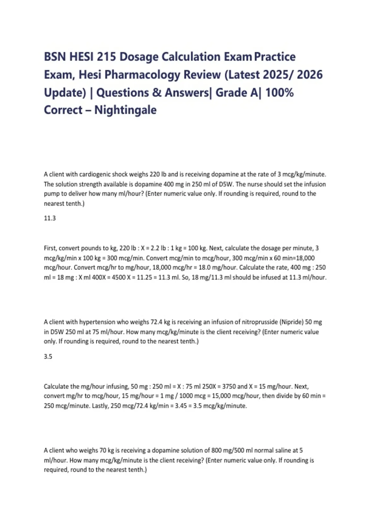 BSN HESI 215 Dosage Calculation Exam Practice