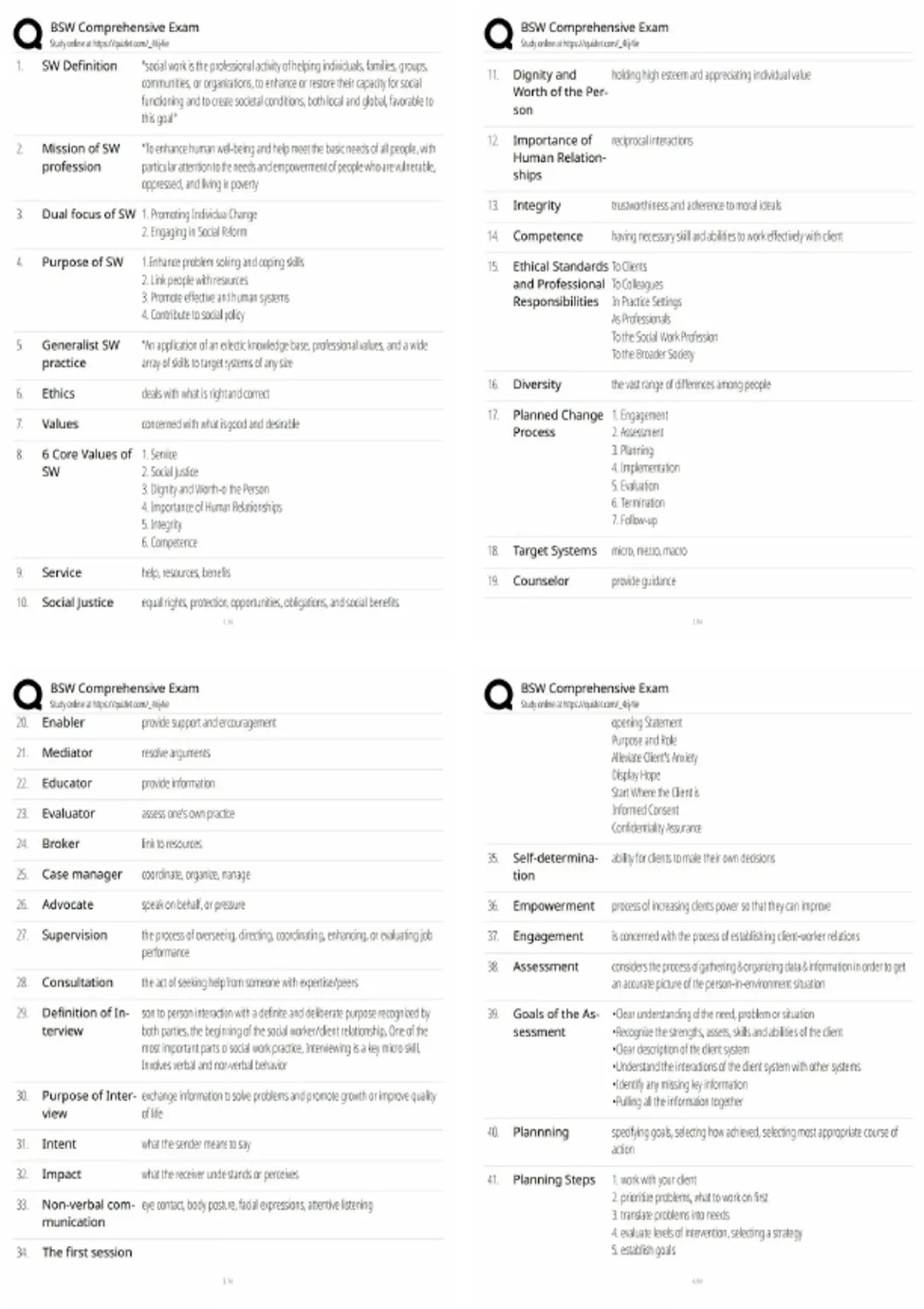 This BSW Comprehensive Exam Study Guide (2025 update) is a high-yield review resource for Bachelor of Social Work students. It covers ethics, practice methods, human behavior theories, policy, research, diversity, and professional roles to help students score 100% on BSW exit exams, quizzes, and final assessments.