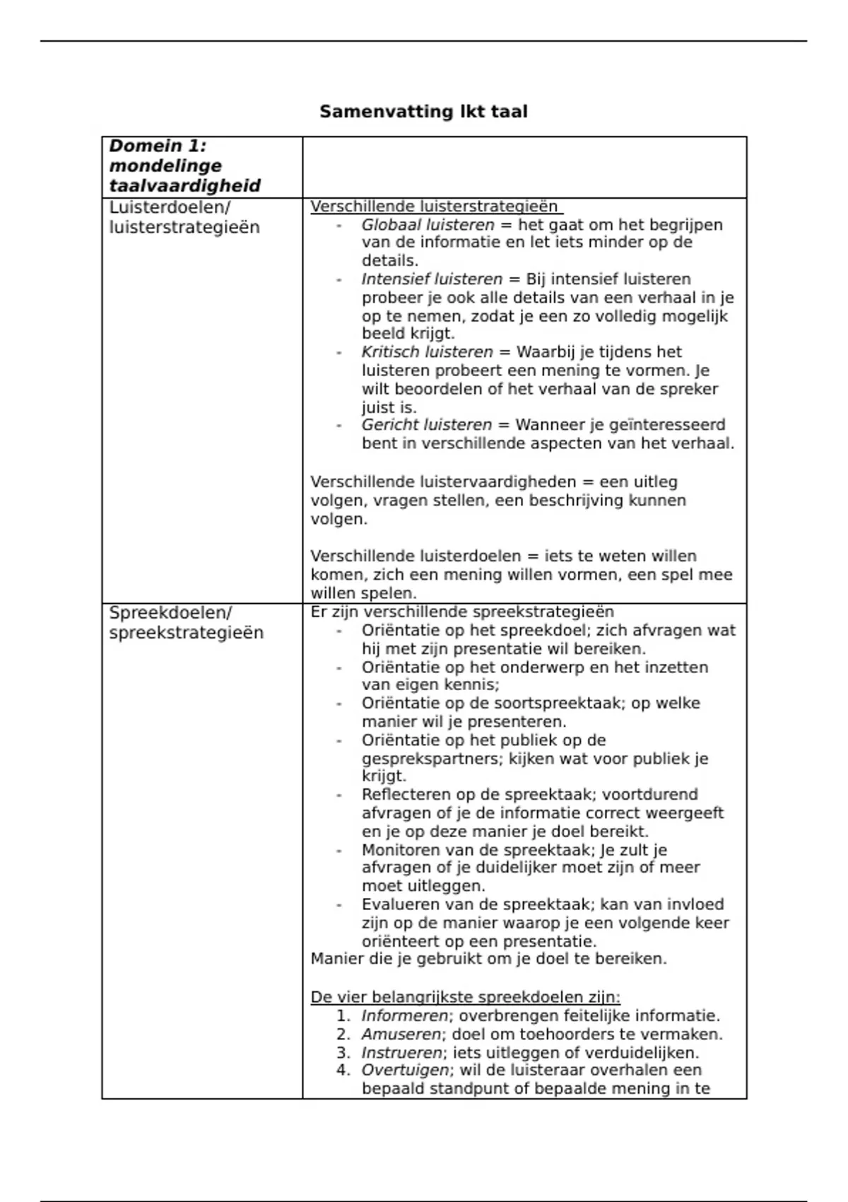samenvatting van het boek basiskennis taalonderwijs. Alles wat je moet weten voor de landelijke kennistoets taal van de pabo. deze samenvatting bevat de volgende onderwerpen: luisterdoelen, luisterstrategieën, spreekdoelen, spreekstrategieën, sociale taalfuncties, cognitieve taalfuncties, taalverwerving, taalontwikkelingsfases, tweedetaalverwerving, communicatieve competentie, receptieve en productieve woordenschat, woordleerstrategieën, woordbetekenis, woordenschat opbouw, vaktaalwoorden, schooltaalwoorden, signaalwoorden, inhoudswoorden, functiewoorden, mentaal lexicon, cognitieve academische taalvaardigheden, woordenschatverwerving, ontluikende geletterdheid, boekoriëntatie en verhaalbegrip, functies van geschreven taal, taalbewustzijn, analfabetisch principe, auditieve vaardigheden, visuele vaardigheden, elementaire leeshandeling, klankzuivere woorden, schriftsysteem, spontane schrijfontwikkeling bij het jonge kind, functionele geletterdheid, functioneel analfabetisme, thuissituatie en geletterdheid, strategieën technisch lezen, voordracht aspecten, niveaubepaling van teksten en leesteksten, automatisering, leesproces, dyslexie, leesdoel bepalen, leesstrategieën, leesvaardigheden, informatieverwerking, studievaardigheden, technieken voor informatieverwerking, tekstsoorten, tekst kenmerken, relaties in teksten, tekst doelen, literaire genres, versvorm en rijm, beoordelingscriteria jeugdliteratuur, tekst kenmerken, tekst structuren, functies van schrijven, schrijfproces, stelstrategieën, elementaire spellingshandeling, spellingstrategieën, spellingscategorieën, werkwoordspelling, principes Nederlandse spelling, functies van taal, taalbeschouwing strategieën, taalvariatie, niveaus van taal, woord benoemen, semantiek, orthografie, metalinguïstisch bewustzijn, taalverandering.