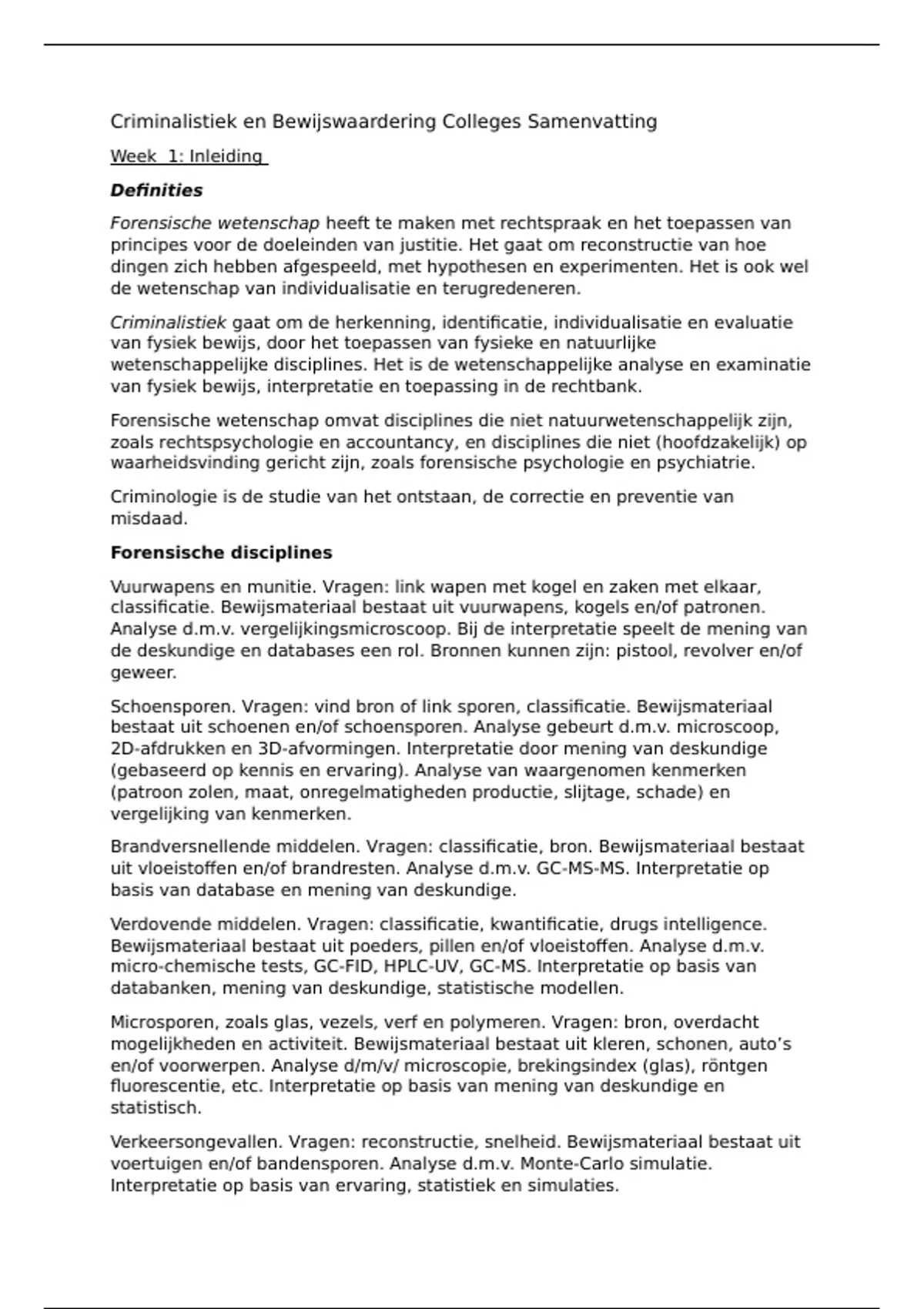 Duidelijke samenvatting van de colleges van Criminalistiek en Bewijswaardering.