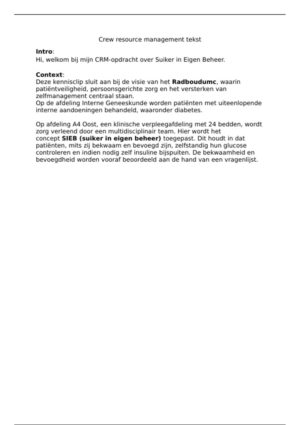 Deze uitwerking bevat een duidelijke analyse van een DIM-melding volgens de CRM-methodiek. De casus wordt stap voor stap uitgewerkt (wat is er gebeurd, oorzaken, verbetermaatregelen en onderbouwing met literatuur). Geschikt als voorbeeld of ondersteuning bij het maken van je eigen CRM-opdracht.