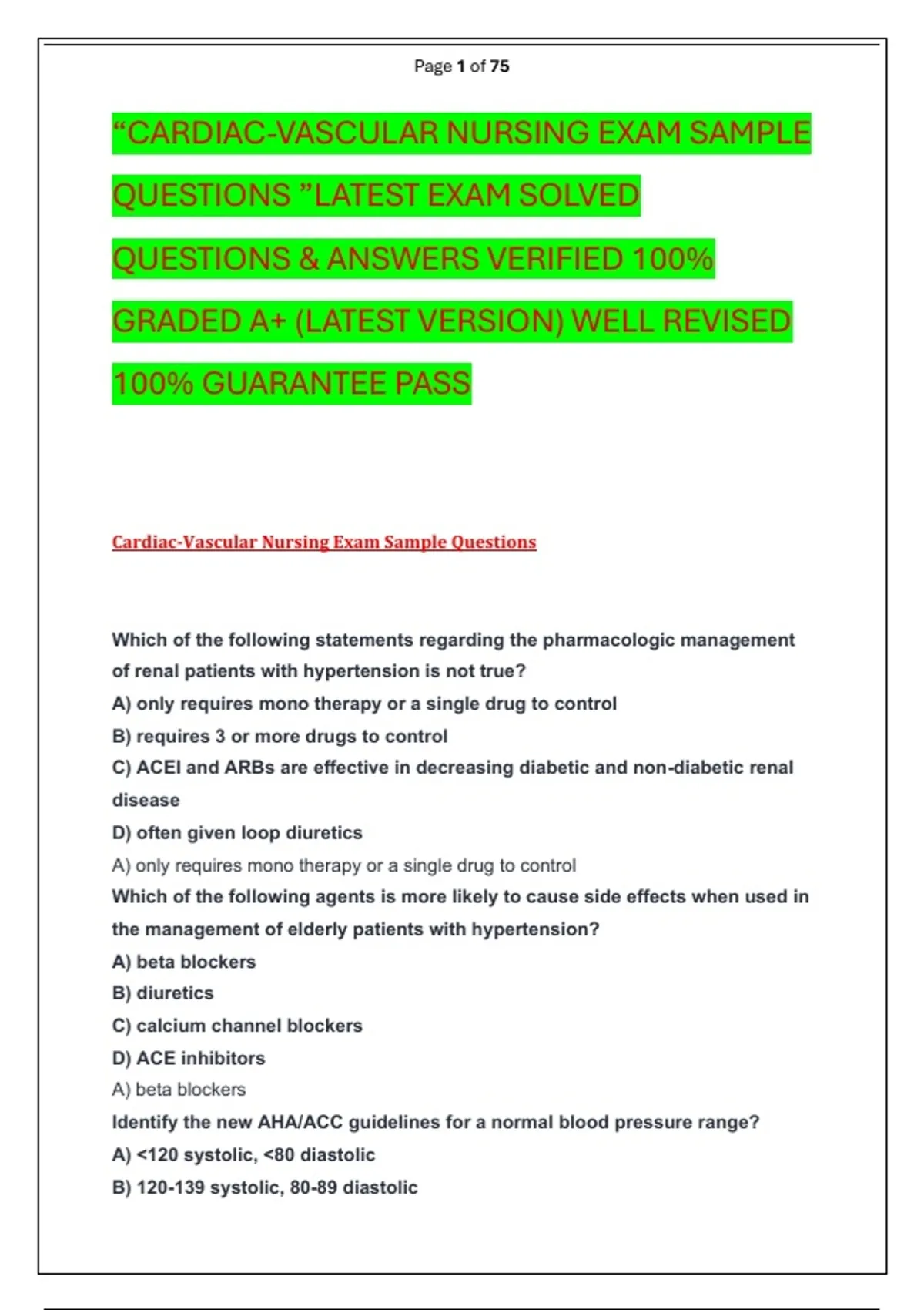 “CARDIAC-VASCULAR NURSING EXAM SAMPLE