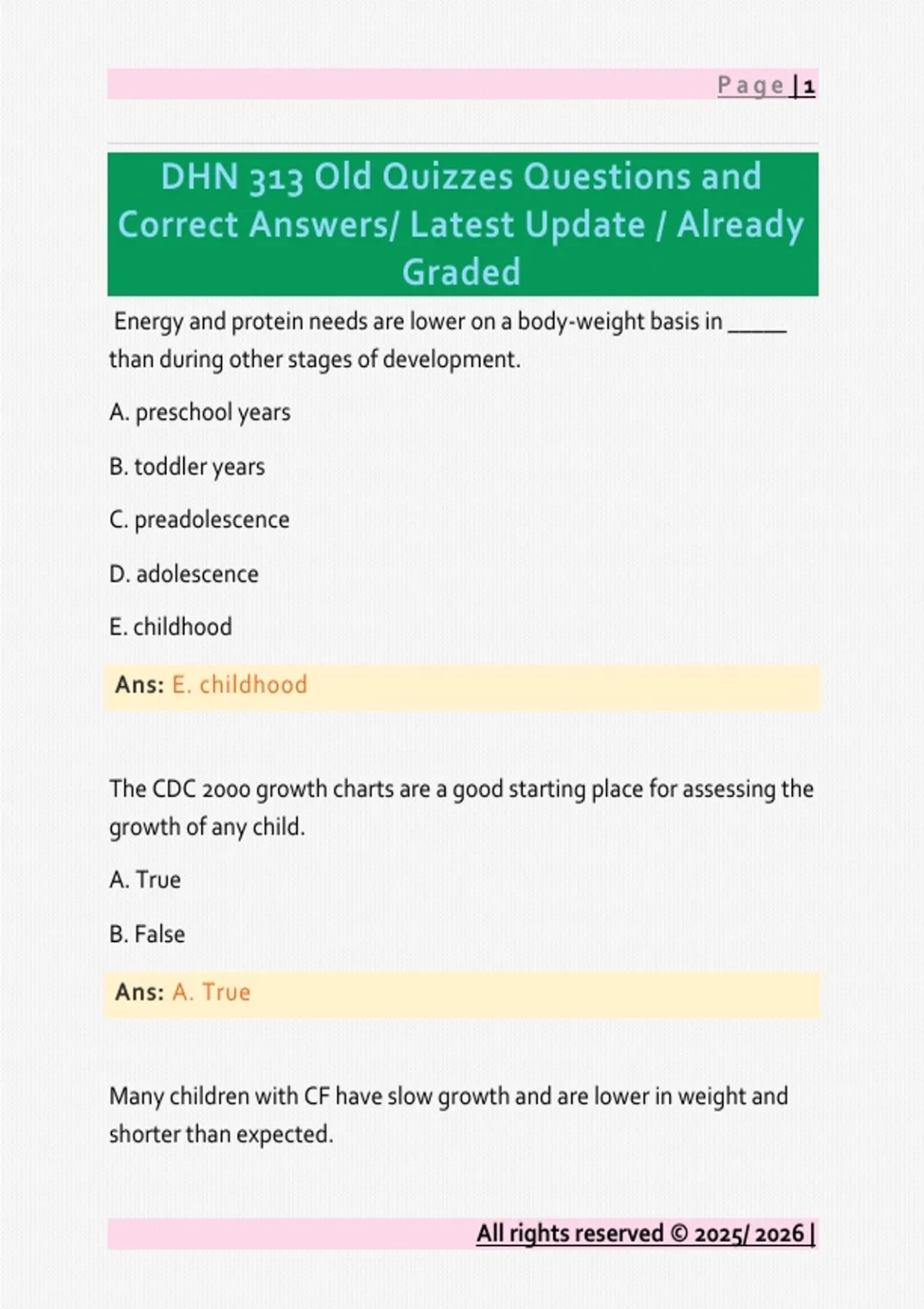 Energy and protein needs are lower on a body-weight basis in _____ than during other stages of development. A. preschool years B. toddler years C. preadolescence D. adolescence E. childhood Ans: E. childhood The CDC 2000 growth charts are a good starting place for assessing the growth of any child. A. True B. False Ans: A. True Many children with CF have slow growth and are lower in weight and shorter than expected. All rights reserved © 2025/ 2026 | Page | 2 A. True B. False Ans: A. True Which program encourages parent-provider-community partnerships so that children with complex medical conditions have access to coordinated, well-planned services? A. SSI B. Child Nutrition Program C. HHS Maternal and Child Health D. Family/Patient Centered Medical Home Program E. Family/Professional Partnerships Program Ans: D. Family/Patient Centered Medical Home Program A child with PKU will only have to follow a special diet until adolescence, after which she or he will be able to consume a normal diet. A. True B. False Ans: B. False