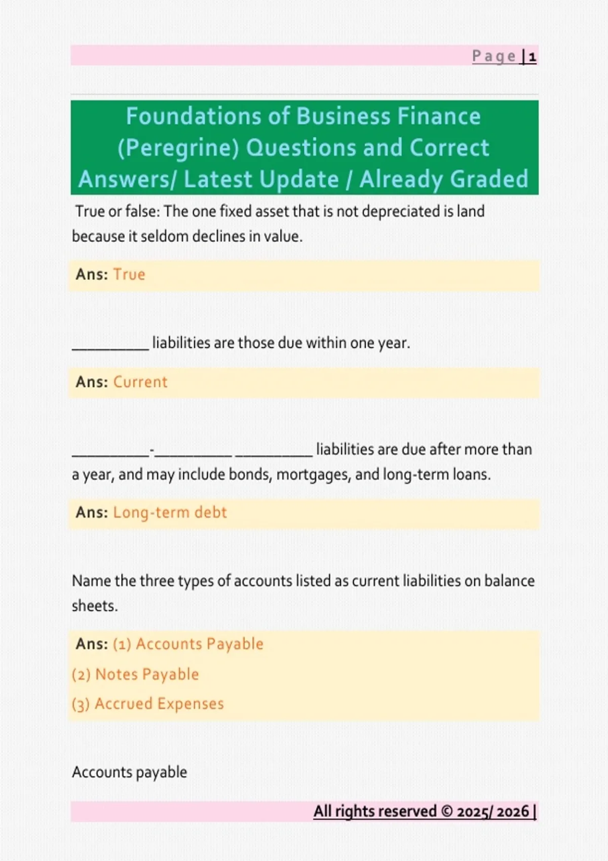 True or false: The one fixed asset that is not depreciated is land because it seldom declines in value. Ans: True __________ liabilities are those due within one year. Ans: Current __________-__________ __________ liabilities are due after more than a year, and may include bonds, mortgages, and long-term loans. Ans: Long-term debt Name the three types of accounts listed as current liabilities on balance sheets. Ans: (1) Accounts Payable (2) Notes Payable (3) Accrued Expenses Accounts payable All rights reserved © 2025/ 2026 | Page | 2 Ans: The amounts owed for credit purchases by a firm Notes payable Ans: Outstanding short-term loans, typically from commercial banks Accrued expenses Ans: Costs that have been incurred by a firm which have not yet been paid; examples of accruals include taxes owed to the government and unpaid wages The __________ __________ section of a balance sheet provides information about the claims against a firm held by investors who own preferred and common shares. Ans: Stockholders' equity The Stockholders' equity section of the balance sheet is reflected in four types of