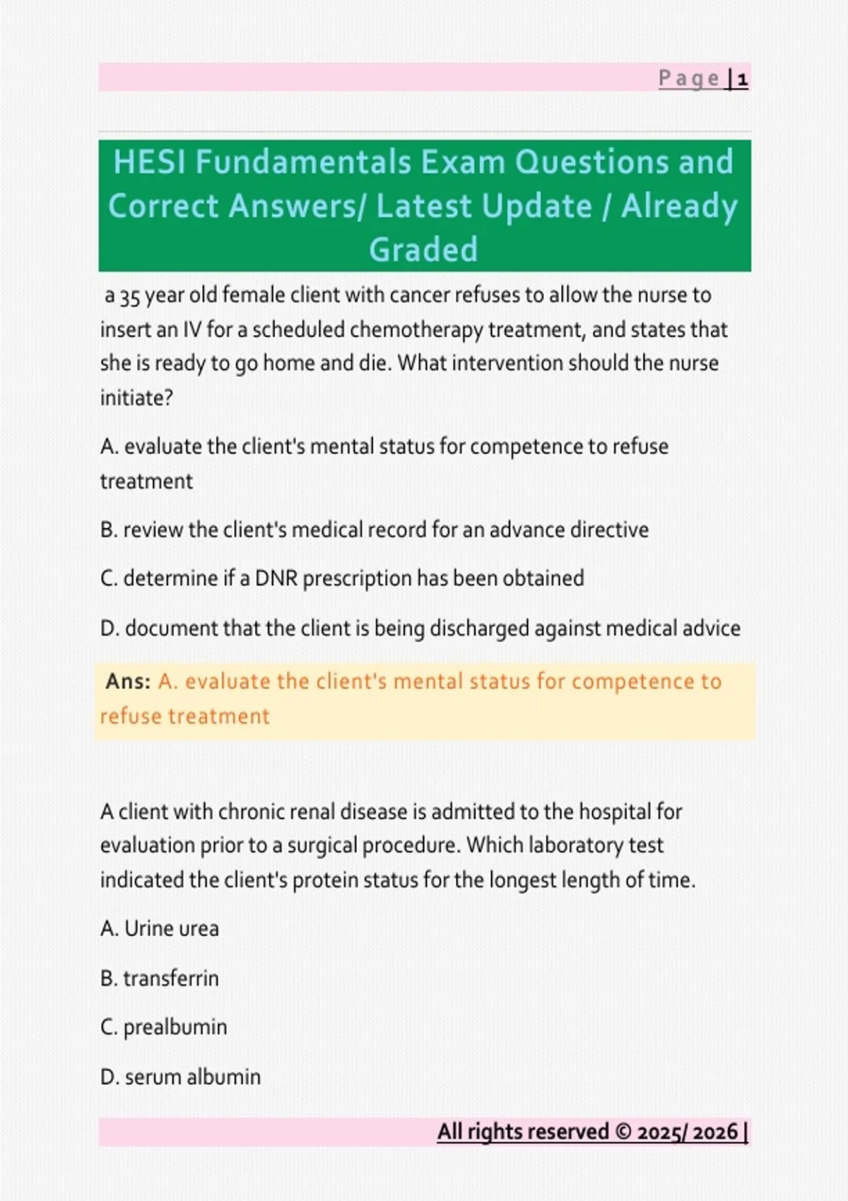 a 35 year old female client with cancer refuses to allow the nurse to insert an IV for a scheduled chemotherapy treatment, and states that she is ready to go home and die. What intervention should the nurse initiate? A. evaluate the client's mental status for competence to refuse treatment B. review the client's medical record for an advance directive C. determine if a DNR prescription has been obtained D. document that the client is being discharged against medical advice Ans: A. evaluate the client's mental status for competence to refuse treatment A client with chronic renal disease is admitted to the hospital for evaluation prior to a surgical procedure. Which laboratory test indicated the client's protein status for the longest length of time. A. Urine urea B. transferrin C. prealbumin D. serum albumin All rights reserved © 2025/ 2026 | Page | 2 Ans: D. serum albumin What client statement indicates to the nurse that the client requires assistance with bathing? A. "I only bathe every other day" B. "I left my eyeglasses at home" C. "I don't understand why I'm so weak and tired" D. "I wasn't able to pack a bag before I left for the hospital" Ans: C. "I don't understand why I'm so weak and tired" How should a nurse handle linens that are soiled with incontinent feces? A. Place the soiled linens in a pillow case and deposit them in the dirty linen hamper B. put the soiled linens in an isolation bag, then place it in the dirty linen hamper C. Ask the housekeeping staff to pick up the soiled linen from the dirty utility room D. place an isolation ham