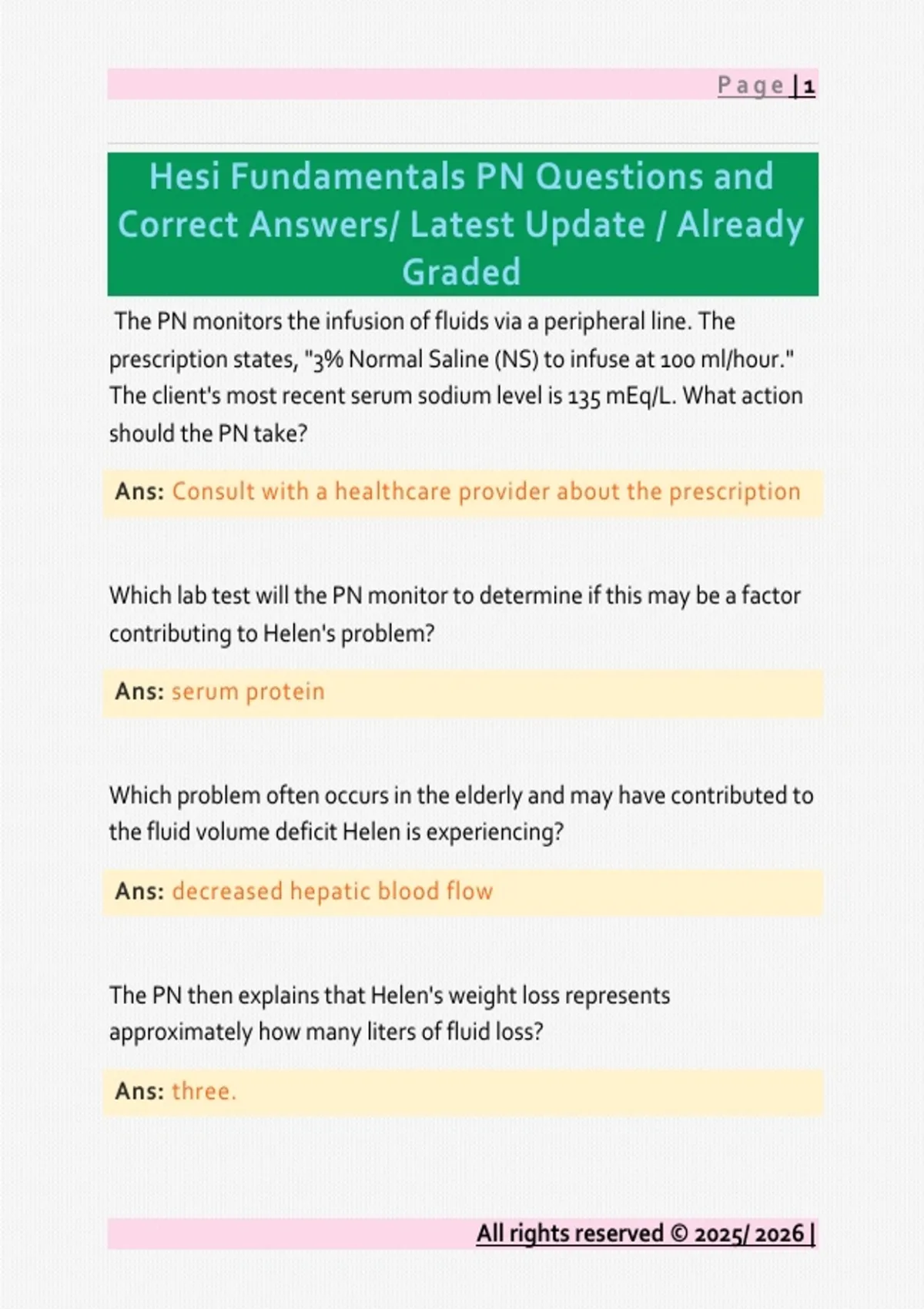 The PN monitors the infusion of fluids via a peripheral line. The prescription states, "3% Normal Saline (NS) to infuse at 100 ml/hour." The client's most recent serum sodium level is 135 mEq/L. What action should the PN take? Ans: Consult with a healthcare provider about the prescription Which lab test will the PN monitor to determine if this may be a factor contributing to Helen's problem? Ans: serum protein Which problem often occurs in the elderly and may have contributed to the fluid volume deficit Helen is experiencing? Ans: decreased hepatic blood flow The PN then explains that Helen's weight loss represents approximately how many liters of fluid loss? Ans: three. All rights reserved © 2025/ 2026 | Page | 2 The PN explains to Helen's daughter that Helen has lost approximately how many pounds? (Enter numerical value only. If rounding is required, round to the whole number.) Ans: 7= 65 kg 2x2 = 143. 150 lbs.-143= 7lbs What action should the PN implement? Ans: document the presence of inelastic skin turgor Since Helen has a fluid volume deficit, the PN anticipates a decrease in which vital sign when Helen moves from a lying to a standing position? Ans: Blood pressure After recording the first blood pressure measurement, what action will the PN take?