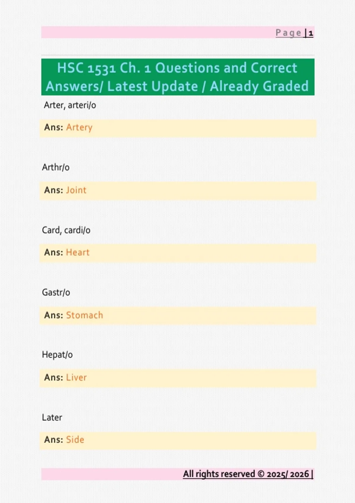 Arter, arteri/o Ans: Artery Arthr/o Ans: Joint Card, cardi/o Ans: Heart Gastr/o Ans: Stomach Hepat/o Ans: Liver Later Ans: Side All rights reserved © 2025/ 2026 | Page | 2 Norm Ans: A common state Oste/o Ans: Bone Path/o Ans: Disease Tens Ans: Pressure Ven/o Ans: Vein Ab- Ans: Away f