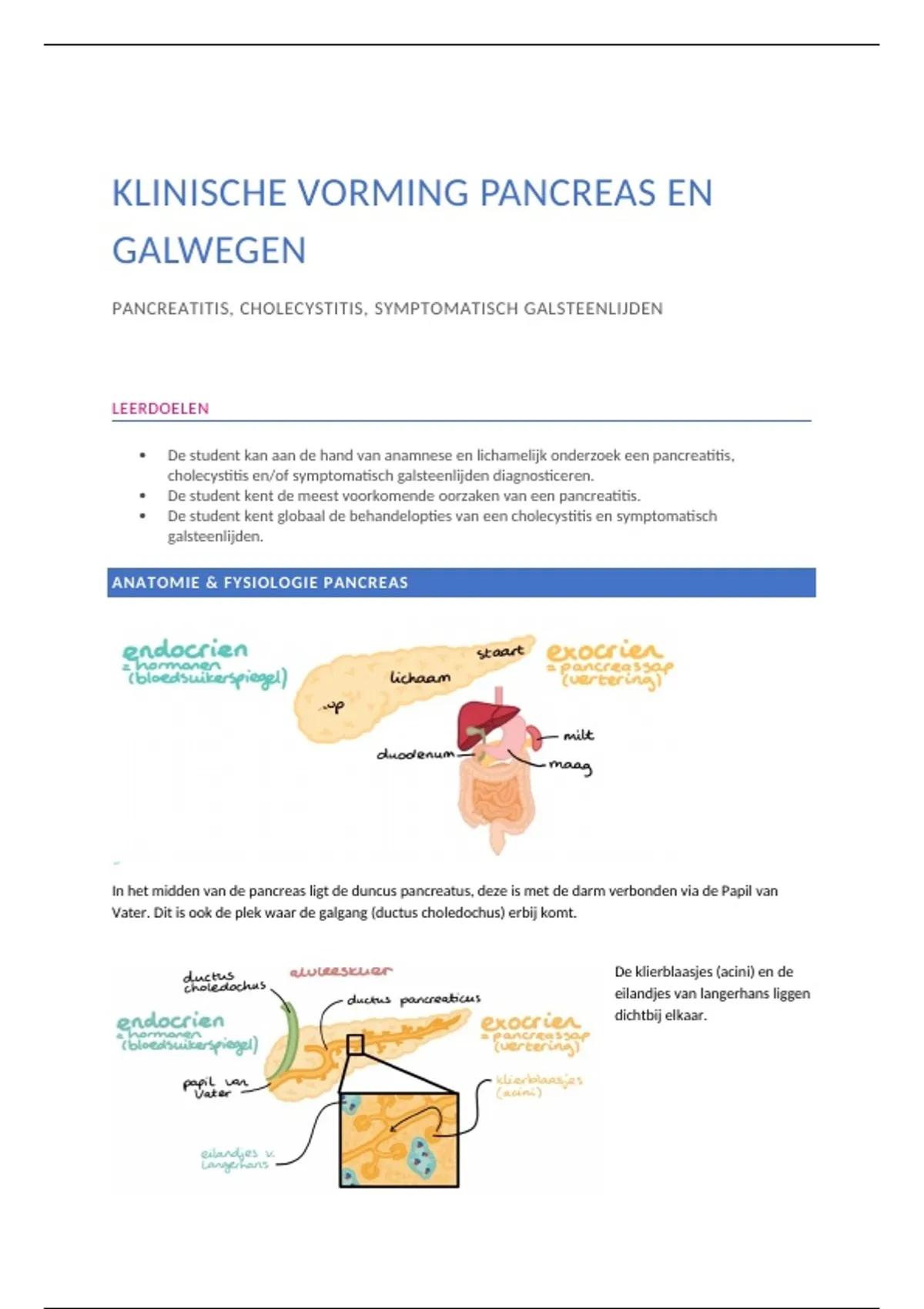 Samenvatting pancreas en galwegen met veelvoorkomende ziektebeelden.