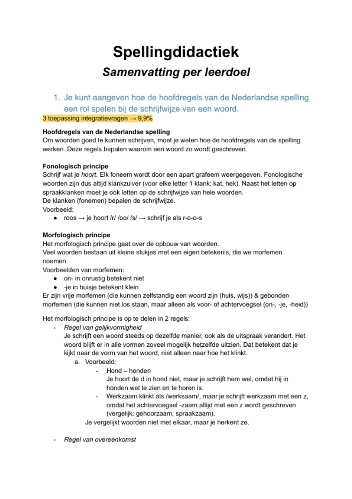 Volledige samenvatting van alle tentamenstof voor het vak Spellingdidactiek. Deze samenvatting is per leerdoel uitgewerkt aan de hand van de toetsmatrijs.
