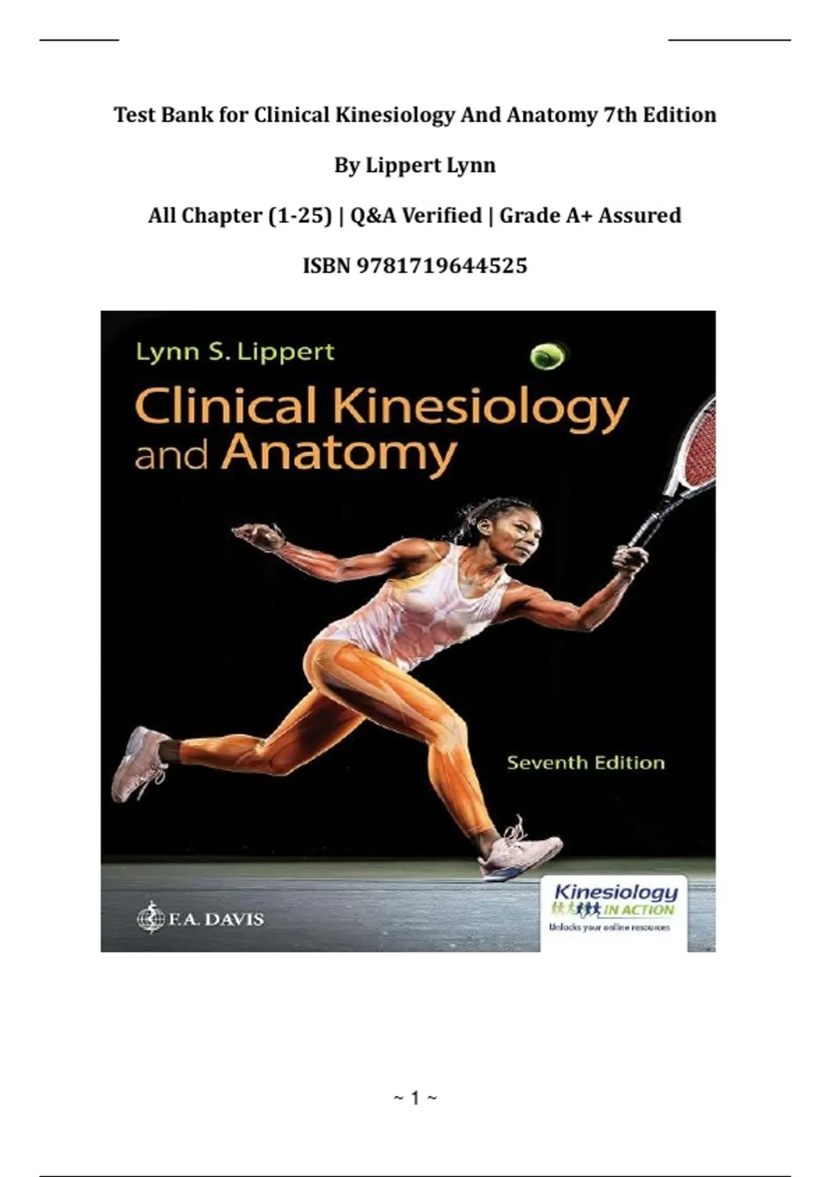Test Bank for Clinical Kinesiology And Anatomy 7th Edition By Lippert Lynn |All Chapter (1-25) | Grade A+ Assured|ISBN 9781719644525