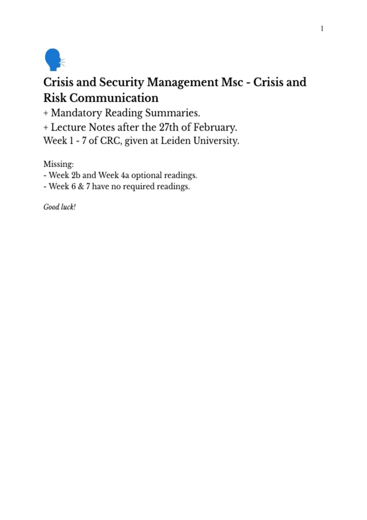 Crisis and Security Management Msc - Crisis and Risk Communication + Mandatory Reading Summaries. + Lecture Notes after the 27th of February. Week 1 - 7 of CRC, given at Leiden University. Missing: - Week 2b and Week 4a optional readings. - Week 6 & 7 have no required readings. No AI was used for this summary.