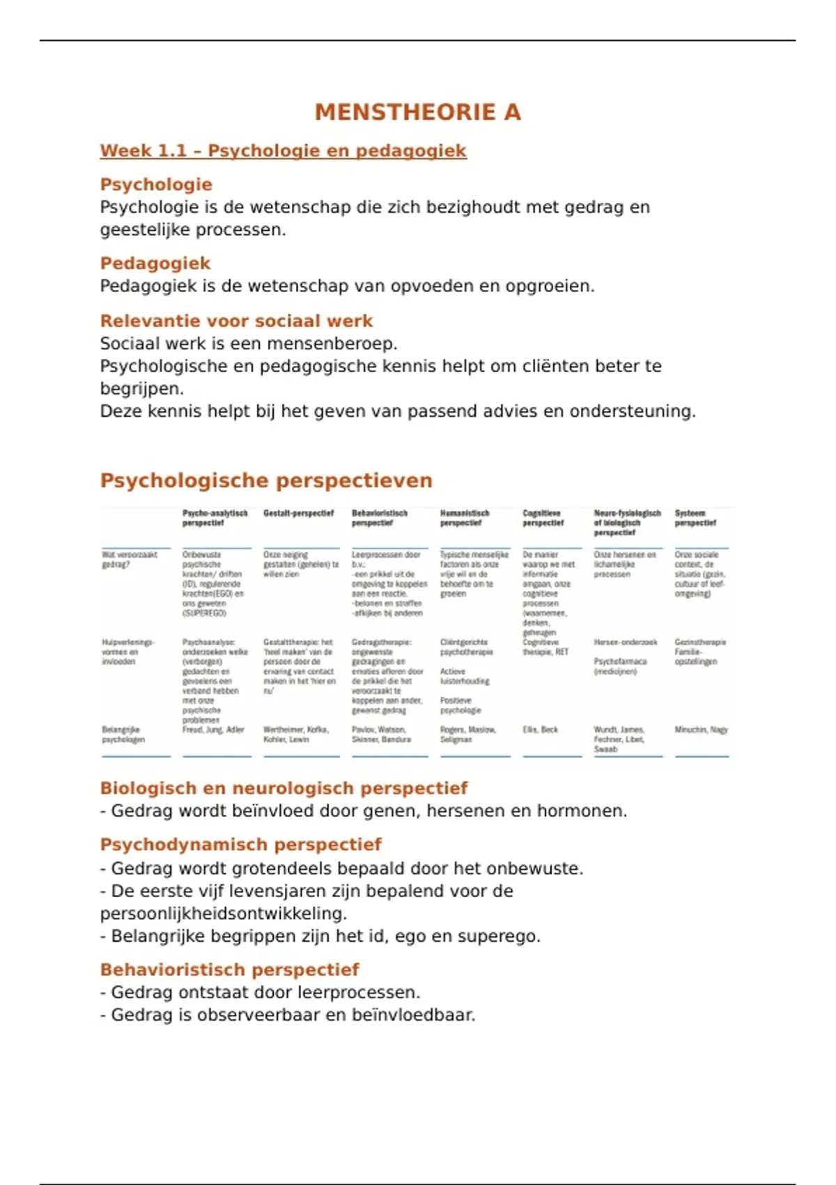 Deze samenvatting van kennislijn Menstheorie A is gebaseerd op de lesstof en leerdoelen van de opleiding Sociaal Werk. De inhoud is overzichtelijk uitgewerkt in korte, duidelijke stukken per onderwerp. De samenvatting is bedoeld als hulpmiddel bij het leren voor tentamens en het verkrijgen van inzicht in menselijk gedrag binnen verschillende contexten. Er is gebruikgemaakt van kernbegrippen en theorieën zoals behandeld tijdens de lessen: Week 1.1 – Psychologie & pedagogiek Week 1.2 – Emoties en empathie Week 1.3 – Communicatie, lichaamstaal, vooroordelen Week 1.4 – Leren & gedrag Week 1.5 – Persoonlijkheid & afweermechanismen Week 1.6 – Attributies & zelfbeeld Week 1.7 – Situaties, systemen en groepen
