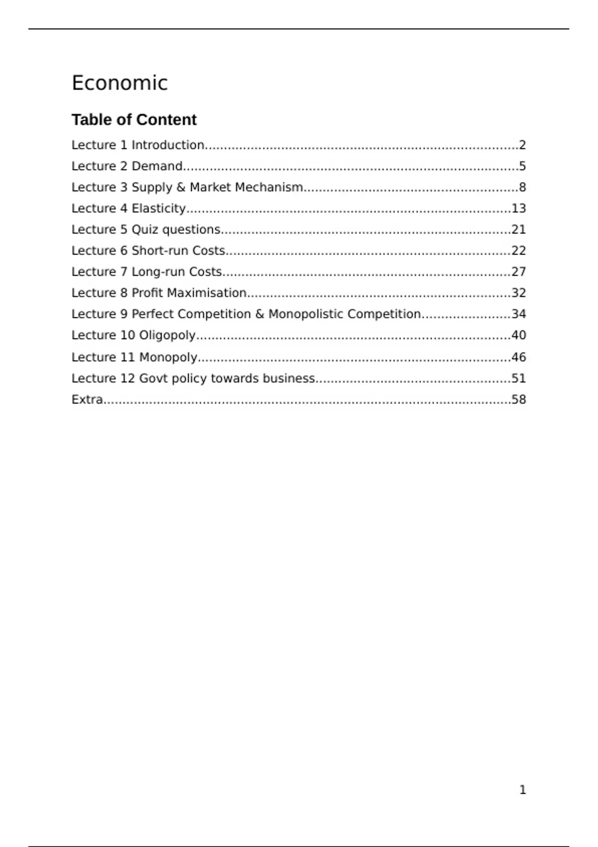This document contains all the material you need to study for your exam and is designed as a complete and structured summary of the Year 1 Economics course. It clearly explains all key economic concepts, theories, and models discussed during the lectures, ranging from basic economic principles to more advanced topics such as elasticity, costs, profit maximisation, market structures, and government intervention. In addition to the theory, the document also includes short quizzes with exam-style questions that are likely to appear on the test. These quizzes allow you to actively practise the material, check your understanding, and become familiar with the type of questions you can expect in the exam. Overall, this document is intended to help you study efficiently, revise effectively, and feel well-prepared and confident going into your exam.