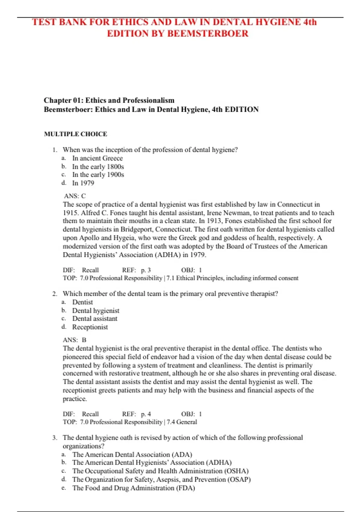 Comprehensive Ethics and Law in Dental Hygiene 4th Edition Test Bank by Beemsterboer with solution, featuring multiple-choice questions, true/false items, short-answer exercises, and case-based scenarios with detailed explanations. Covers: