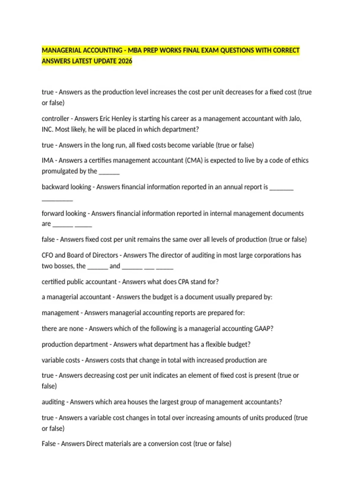 true - Answers as the production level increases the cost per unit decreases for a fixed cost (true