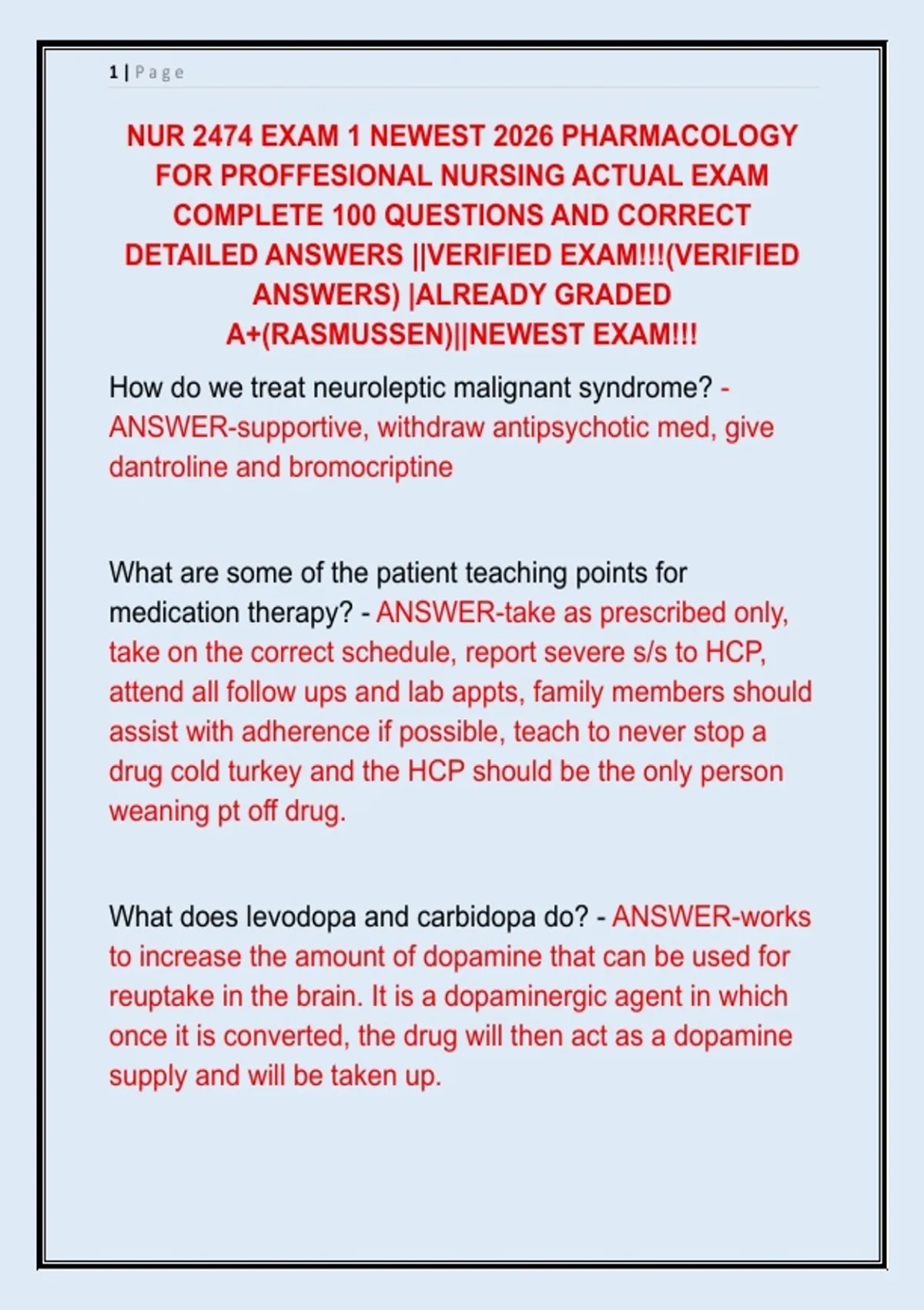 NUR 2474 EXAM 1 NEWEST 2026 PHARMACOLOGY FOR PROFFESIONAL NURSING ACTUAL EXAM COMPLETE 100 QUESTIONS AND CORRECT DETAILED ANSWERS ||VERIFIED EXAM!!!(VERIFIED ANSWERS) |ALREADY GRADED A+(RASMUSSEN)||NEWEST EXAM!!!