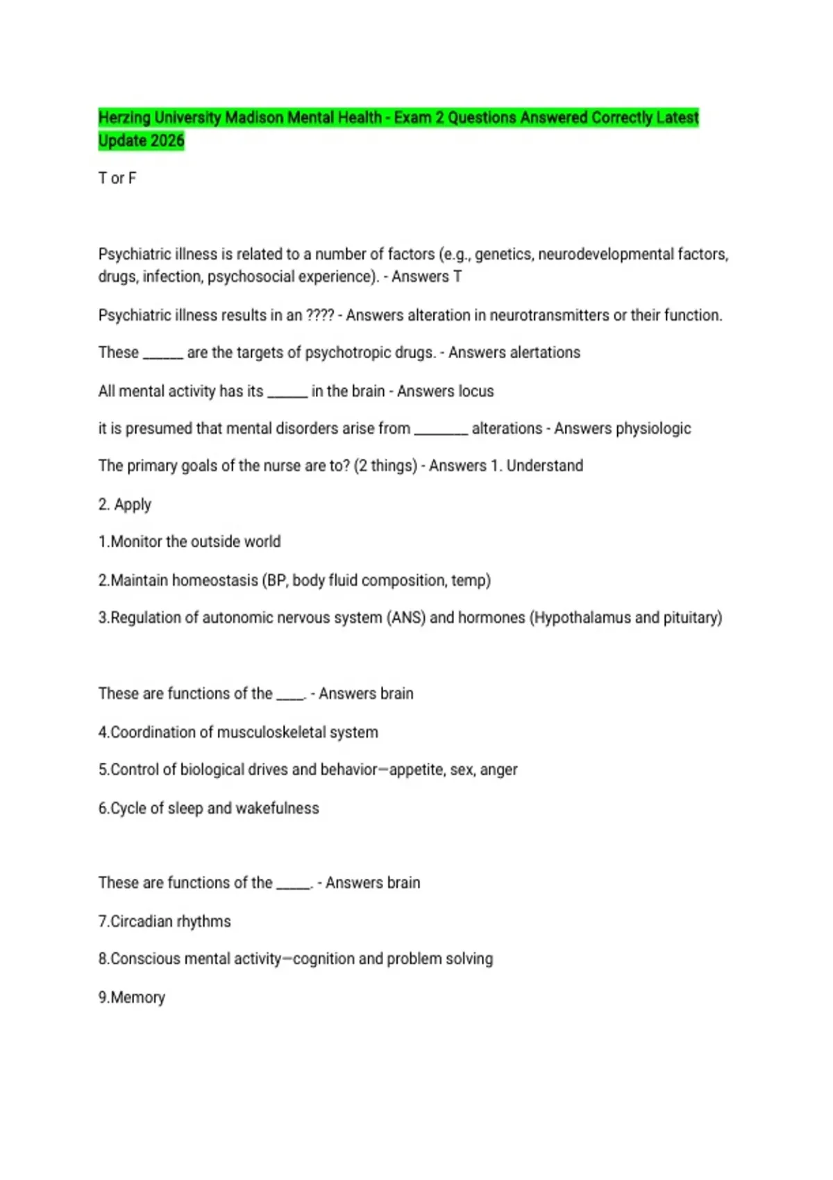 Herzing University Madison Mental Health - Exam 2 Questions Answered Correctly Latest Update 2026 T or F Psychiatric illness is related to a number of factors (e.g., genetics, neurodevelopmental factors, drugs, infection, psychosocial experience). - Answers T Psychiatric illness results in an ???? - Answers alteration in neurotransmitters or their function. These ______ are the targets of psychotropic drugs. - Answers alertations All mental activity has its ______ in the brain - Answers locus it is presumed that mental disorders arise from ________ alterations - Answers physiologic The primary goals of the nurse are to? (2 things) - Answers 1. Understand 2. Apply 1.Monitor the outside world 2.Maintain homeostasis (BP, body fluid composition, temp) 3.Regulation of autonomic nervous system (ANS) and hormones (Hypothalamus and pituitary) These are functions of the ____. - Answers brain 4.Coordination of musculoskeletal system 5.Control of biological drives and behavior—appetite, sex, anger 6.Cycle of sleep and wakefulness These are functions of the _____. - Answers brain 7.Circadian rhythms 8.Conscious mental activity—cognition and problem solving 9.Memory These are functions of the ____. - Answers brain 10. Social skills 11. Language These are functions of the _____. - Answers brain 1. Regulates internal organs 2. Responsible for vital functions These are functions of the _______. - Answers brain stem 3. Reticular activating system (RAS) regulates sleep/wakefulness 4. Initial processing center for sensory information that is sent to the cerebral cortex These are functions of the _______. - Answers brain stem 5. Mesolimbic pathways project into the limbic system, modulates emotional value of sensory information These are functions of the _______. - Answers brain stem Limbic cortex is responsible for? - Answers mood hippocampus is responsible for? - Answers memory amydala is responsible for? - Answers emotions like fear and anxiety hypothalmus is responsible for? - Answers limbic output Regulates emotion and memory. - Answers Limbic system Reward Center. - Answers Limbic system Directly connects lower and higher brain functions. - Answers Limbic system Influences emotional response, visceral responses to emotions, motivation, mood, and sensations of pain and pleasure. - Answers Limbic system Plays role in addiction, mood disorders, bipolar disorder, schizophrenia. - Answers Limbic system Curved sheet of cortex folded in the medial temporal lobe - Answers Hippocampus Shown to be underdeveloped in schizophrenia and atrophied in recurrent depression and PTSD. - Answers Hippocampus Exercise, as well as SSRIs, have been shown to help this regenerate - Answers Hippocampus Interacts with the prefrontal areas in memory and learning - Answers Hippocampus This is an important in psychiatry because of it's connection to the endocrine system. - Answers Hypothalamus This sends out releasing factors that direct the anterior pituitary to send out its hormones to the target glands. (Gonadotropin-releasing hormone and corticotropin-releasing hormone) - Answers Hypothalamus The adrenal glands and the thyroid gland have been implicated in mood disorders. - Answers Hypothalamus help to control voluntary motor movements - Answers Basal Ganglia Multiple psychotropic medications can affect this area and cause movement disorders known as extrapyramidal symptoms (EPS) - Answers Basal Ganglia Damage may cause problems controlling speech, movement, and posture - Answers Basal Ganglia