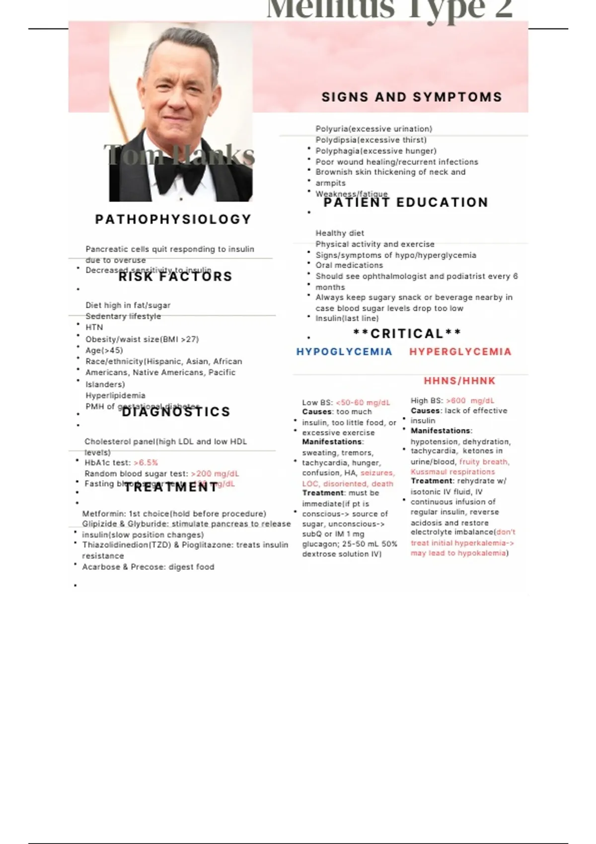 Thiazolidinedion(TZD) & Pioglitazone: treats insulin glucagon; 25-50 mL 50% treat initial hyperkalemia->