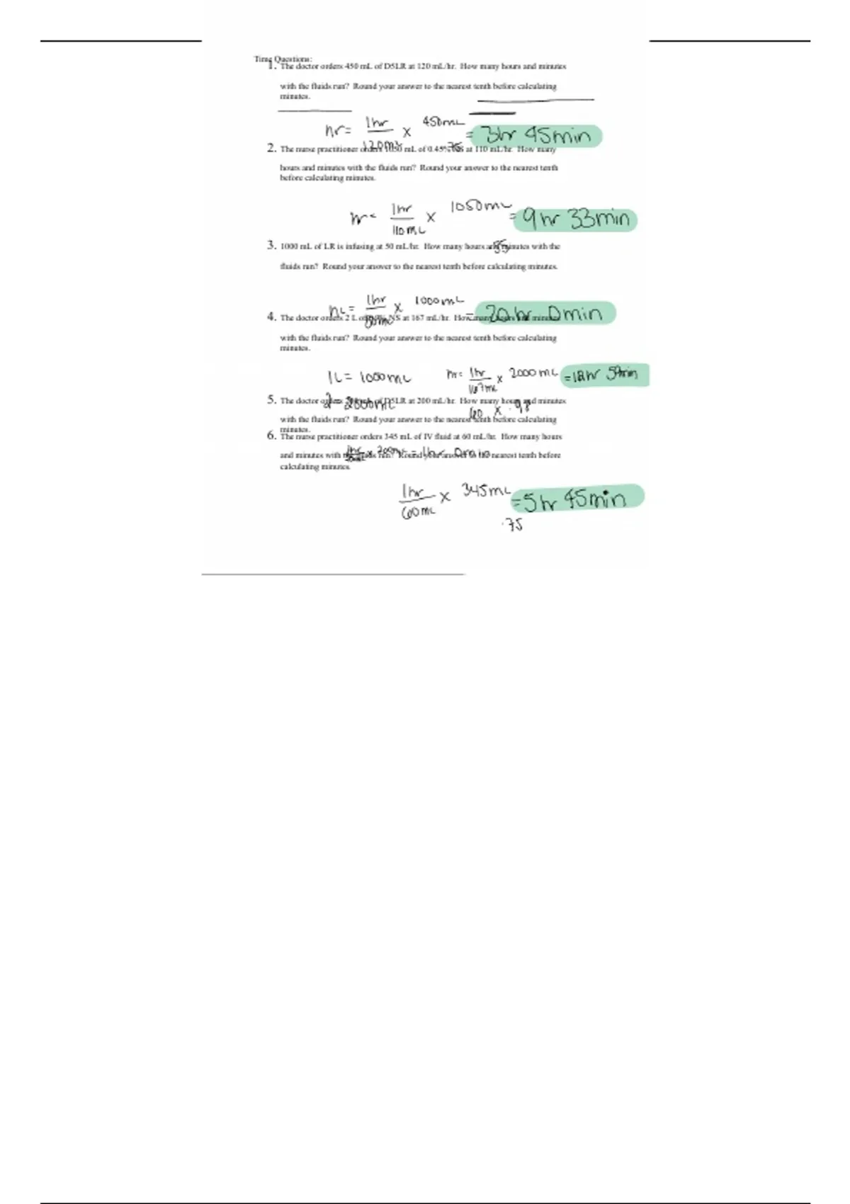 1. The doctor orders 450 mL of D5LR at 120 mL/hr. How many hours and minutes