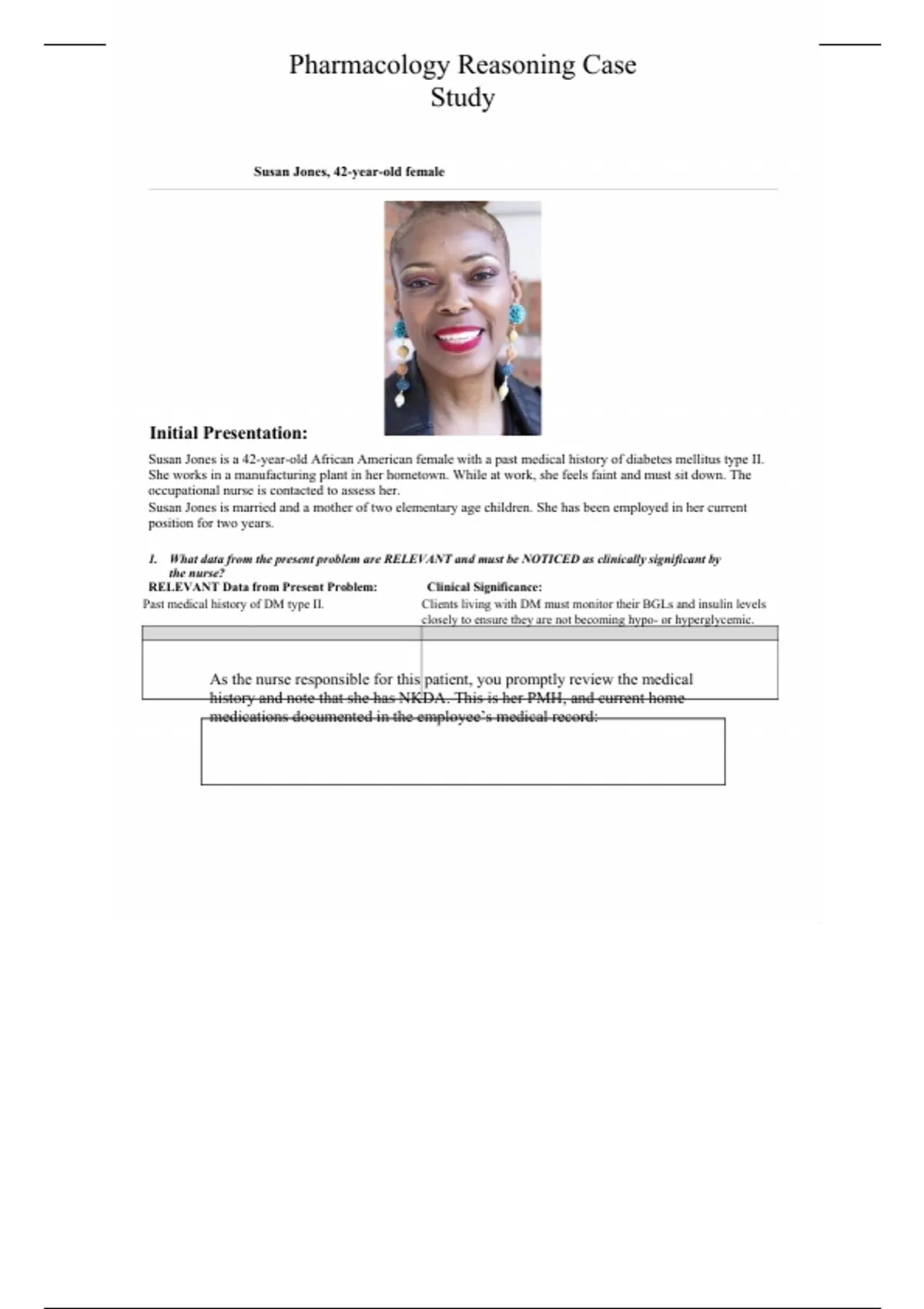 Susan Jones is a 42-year-old African American female with a past medical history of diabetes mellitus type II.