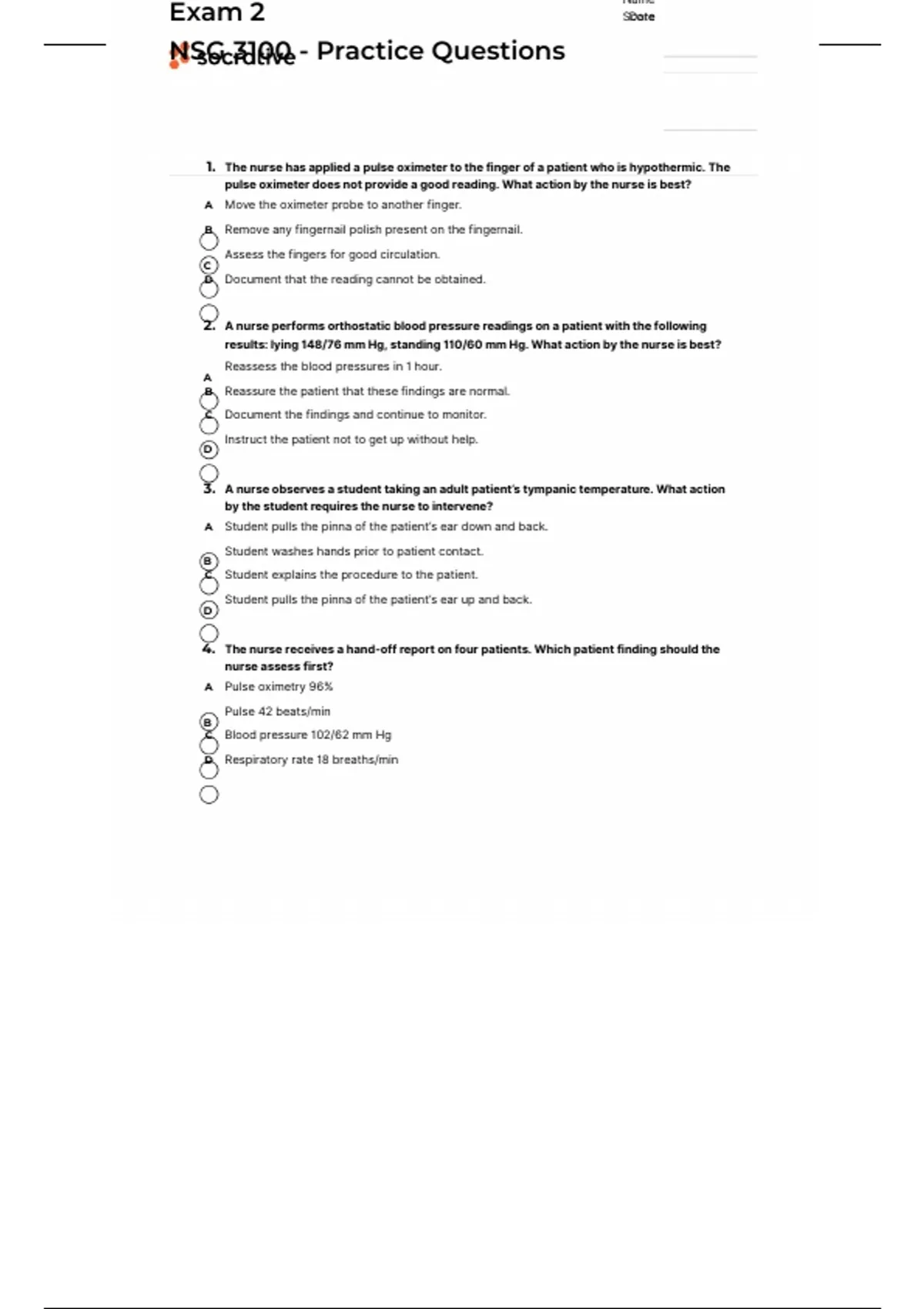 NSG 3100 Exam 2 Practice Questions for Fundamentals AssessmentNSG 3100 Exam 2 Practice Questions for Fundamentals Assessment