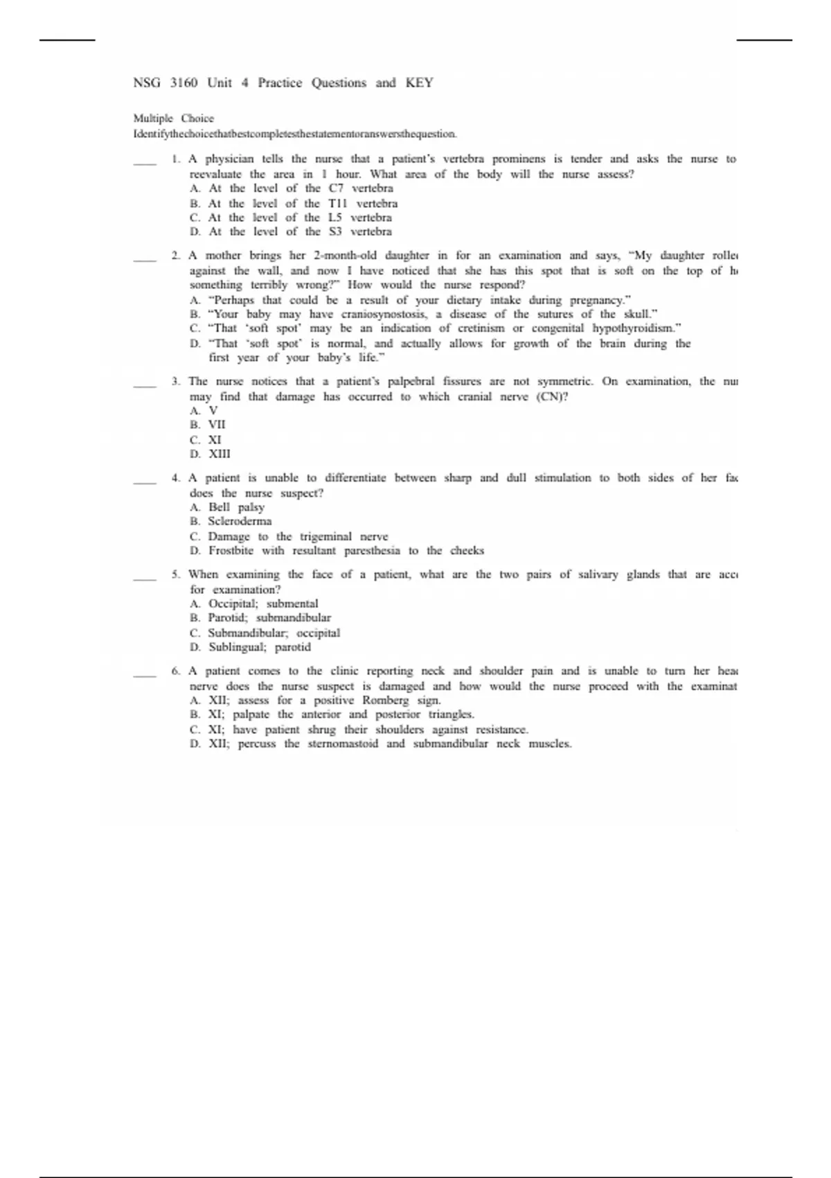____ 3. The nurse notices that a patient’s palpebral fissures are not symmetric. On examination, the nur
