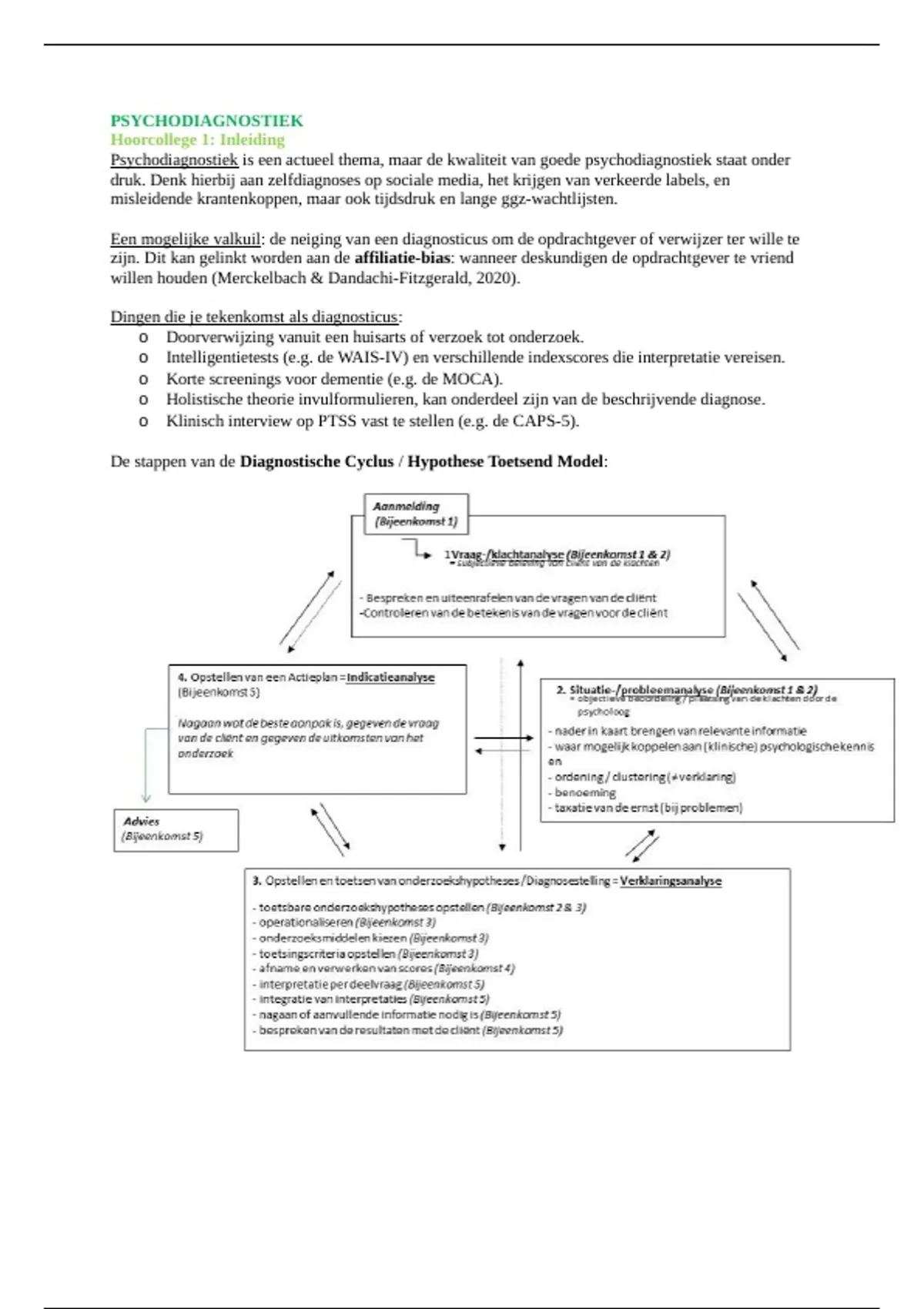 Dit zijn al mijn aantekeningen van alle hoorcolleges van psychodiagnostiek, geschreven eind 2025. Deze cursus heeft sinds deze periode geen tentamen meer, maar in het reflectieverslag moet er literatuur en/of hoorcollege materiaal voor gebruikt worden, dus deze samenvatting kan daarvoor handig zijn, of als je al aantekeningen wilt hebben die je tijdens de hoorcolleges kunt aanvullen ipv alles opnieuw typen. :)