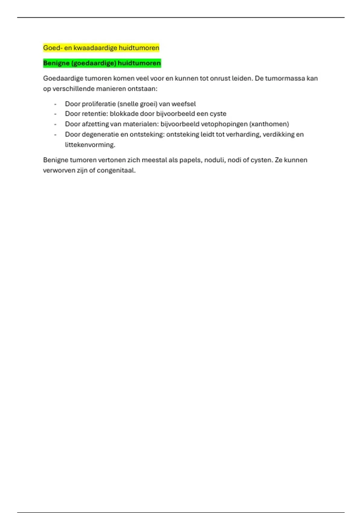 Deze samenvatting betreft informatie over de verschillende huidtumoren, van benigne (goedaardig) tot maligne (kwaadaardig). Alle huidtumoren worden per soort besproken.