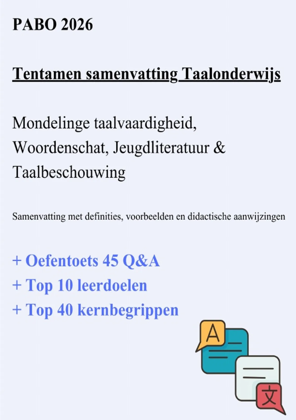 Het document geeft een overzicht van taalonderwijs in het basisonderwijs. Het behandelt hoe kinderen mondelinge taalvaardigheid, woordenschat, jeugdliteratuur en taalbeschouwing ontwikkelen en hoe leerkrachten dit didactisch kunnen begeleiden. Daarbij komen taalverwervingstheorieën, communicatieve competenties, woordenschatdidactiek, leesbevordering en metalinguïstisch bewustzijn aan bod, met als doel leerlingen taal effectief te laten gebruiken om te leren, denken en communiceren. Inclusief de nieuwe oefentoets met alle antwoorden.