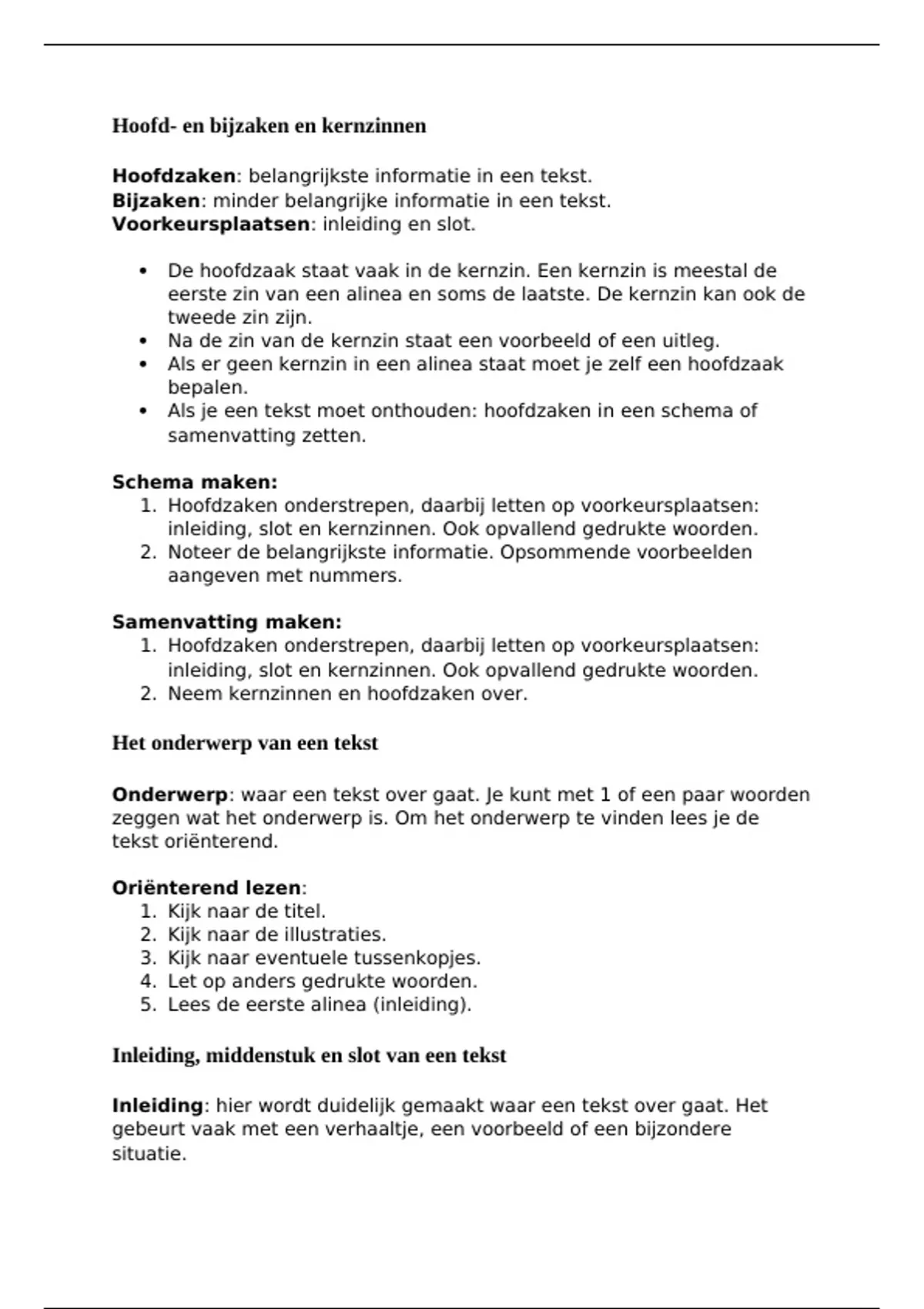 inleiding, slot en kernzinnen. Ook opvallend gedrukte woorden.
