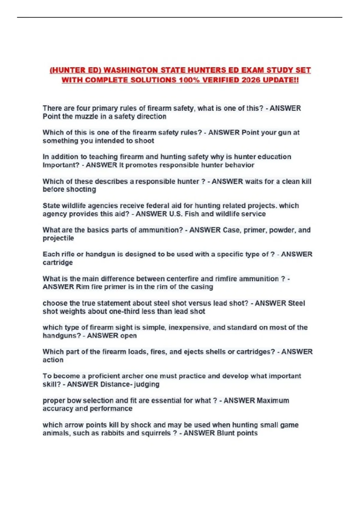 (HUNTER ED) WASHINGTON STATE HUNTERS ED EXAM STUDY SET WITH COMPLETE SOLUTIONS 100% VERIFIED 2026 UPDATE!!...