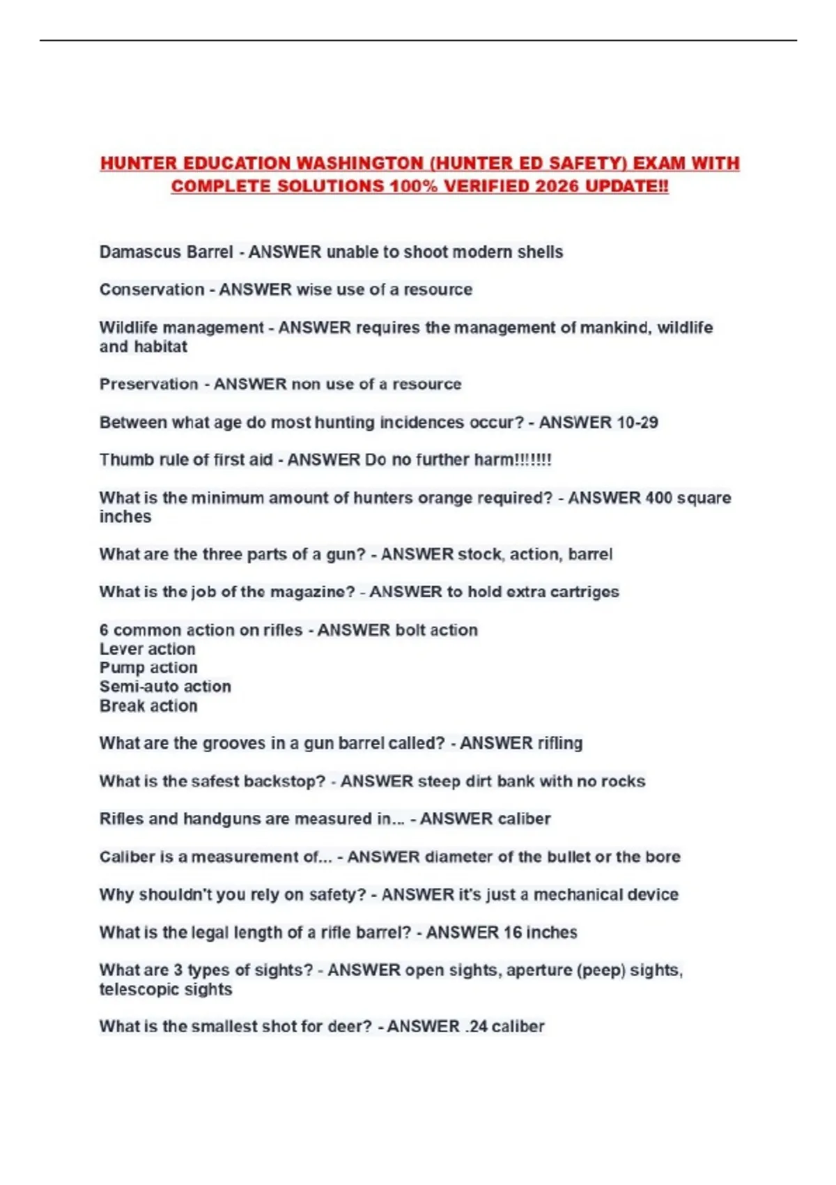 HUNTER EDUCATION WASHINGTON (HUNTER ED SAFETY) EXAM WITH COMPLETE SOLUTIONS 100% VERIFIED 2026 UPDATE!!...