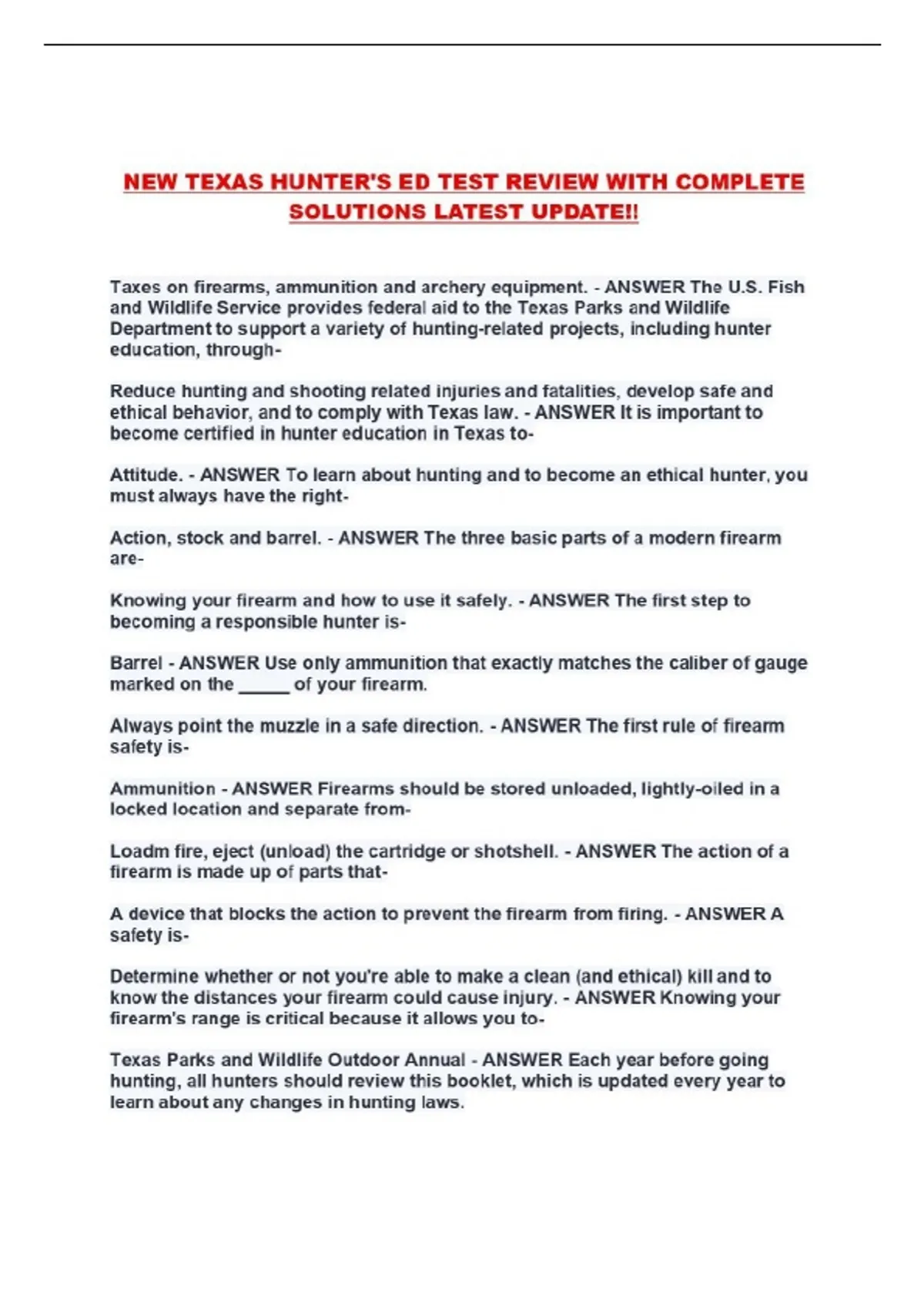 NEW TEXAS HUNTER'S ED TEST REVIEW WITH COMPLETE SOLUTIONS LATEST UPDATE!!...