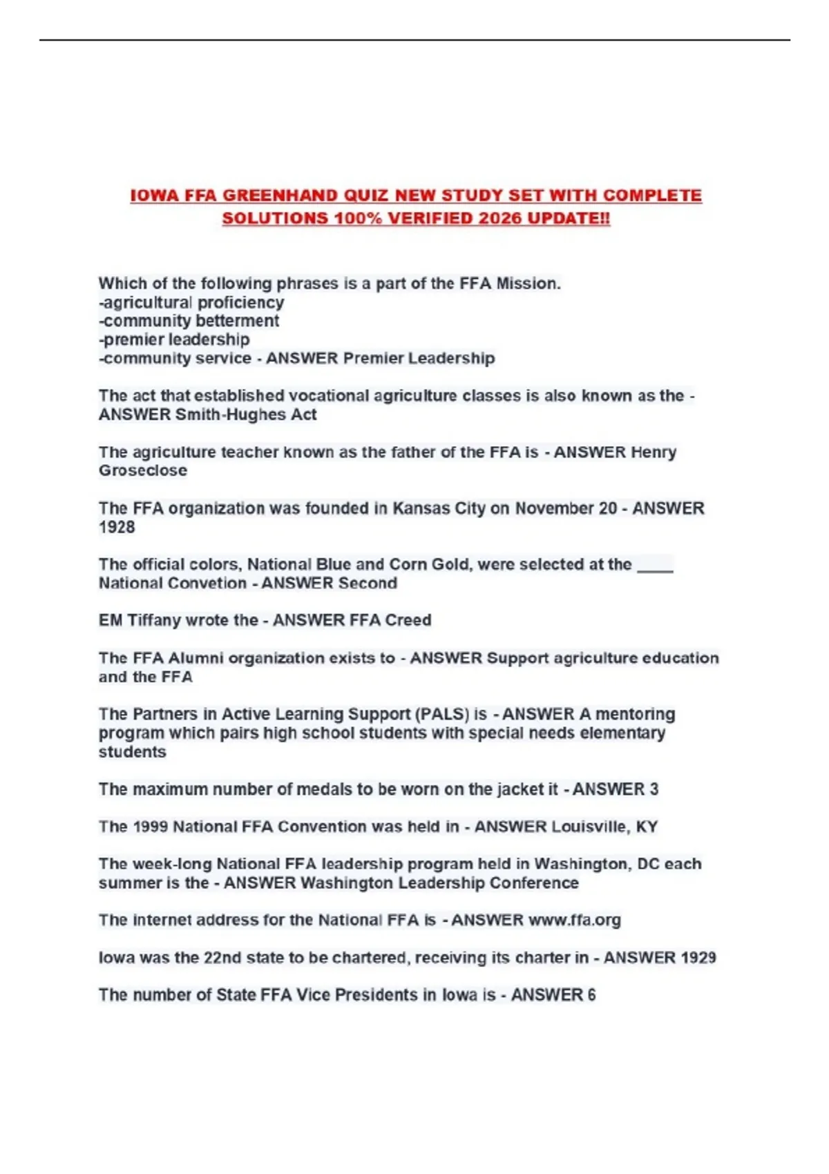 IOWA FFA GREENHAND QUIZ NEW STUDY SET WITH COMPLETE SOLUTIONS 100% VERIFIED 2026 UPDATE!!